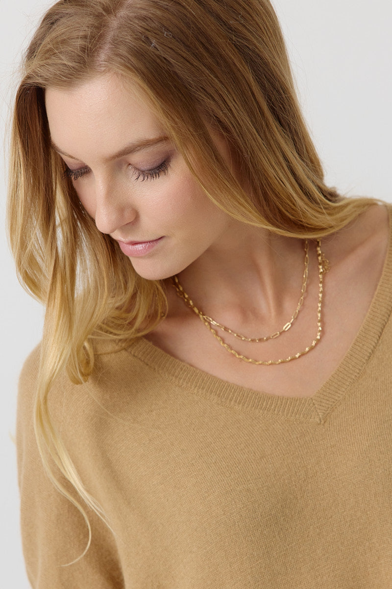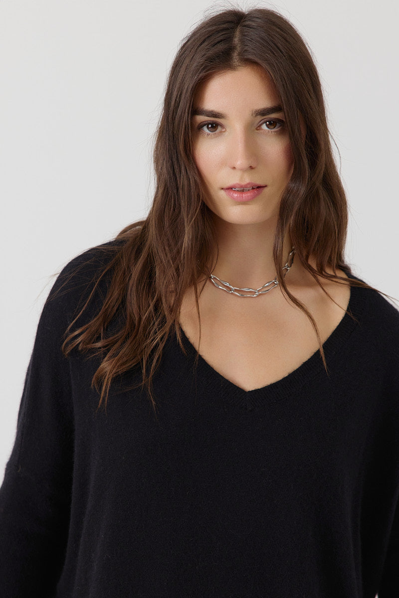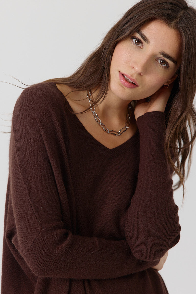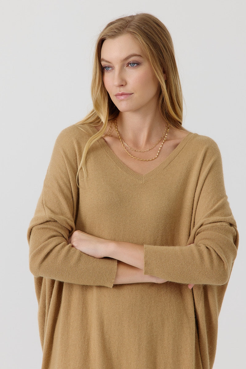 Robe pull ample à col V, en maille douce et chaude, idéale pour l’hiver. Coupe droite et manches longues avec emmanchures descendues.