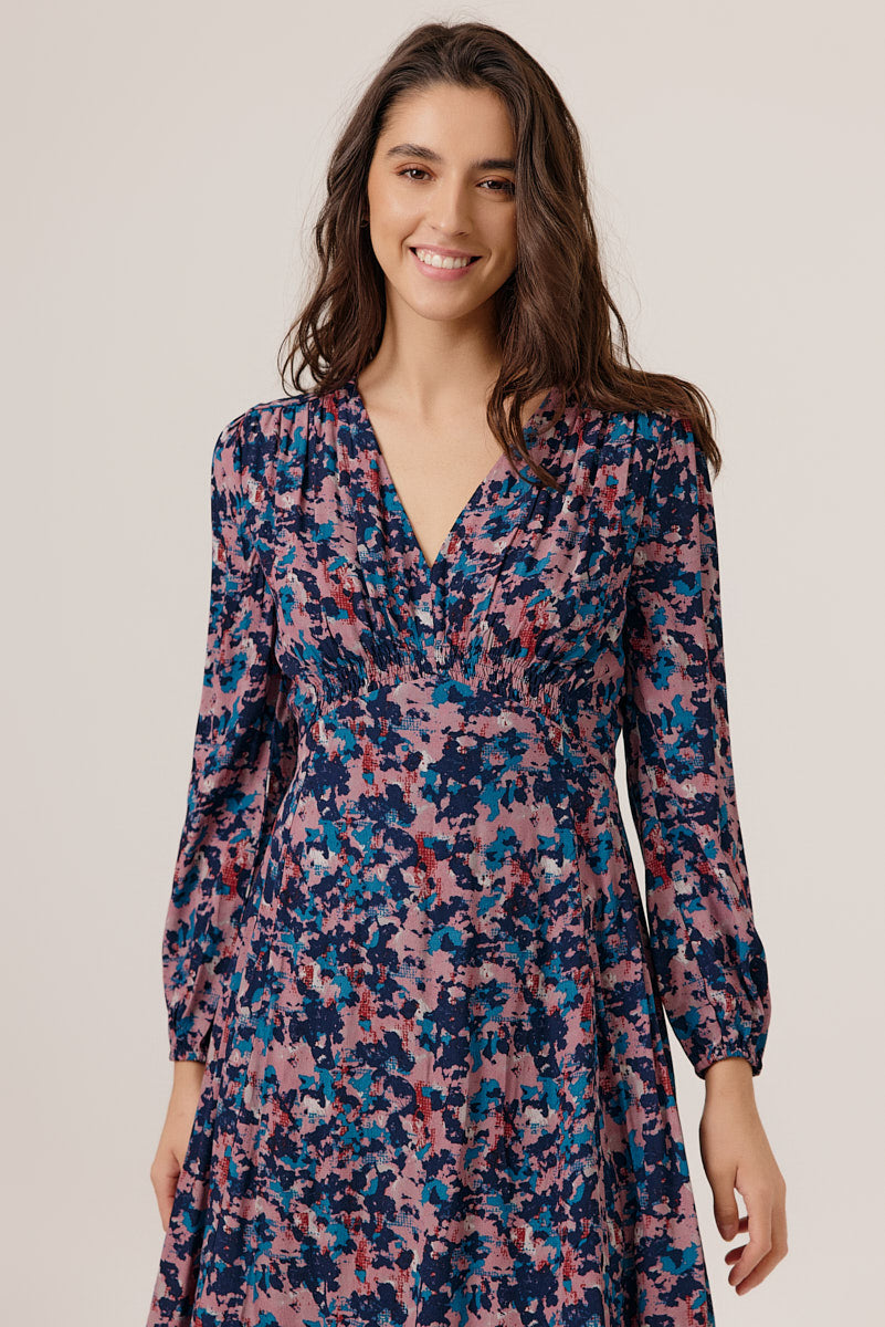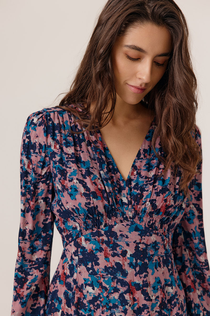 Féminine et joyeuse, cette robe courte à motif floral mêle des tons vifs sur une base prune. Coupe fluide et taille ajustée.