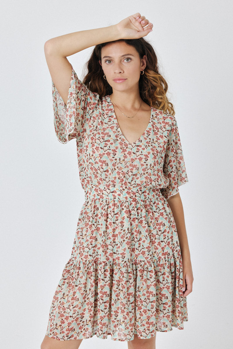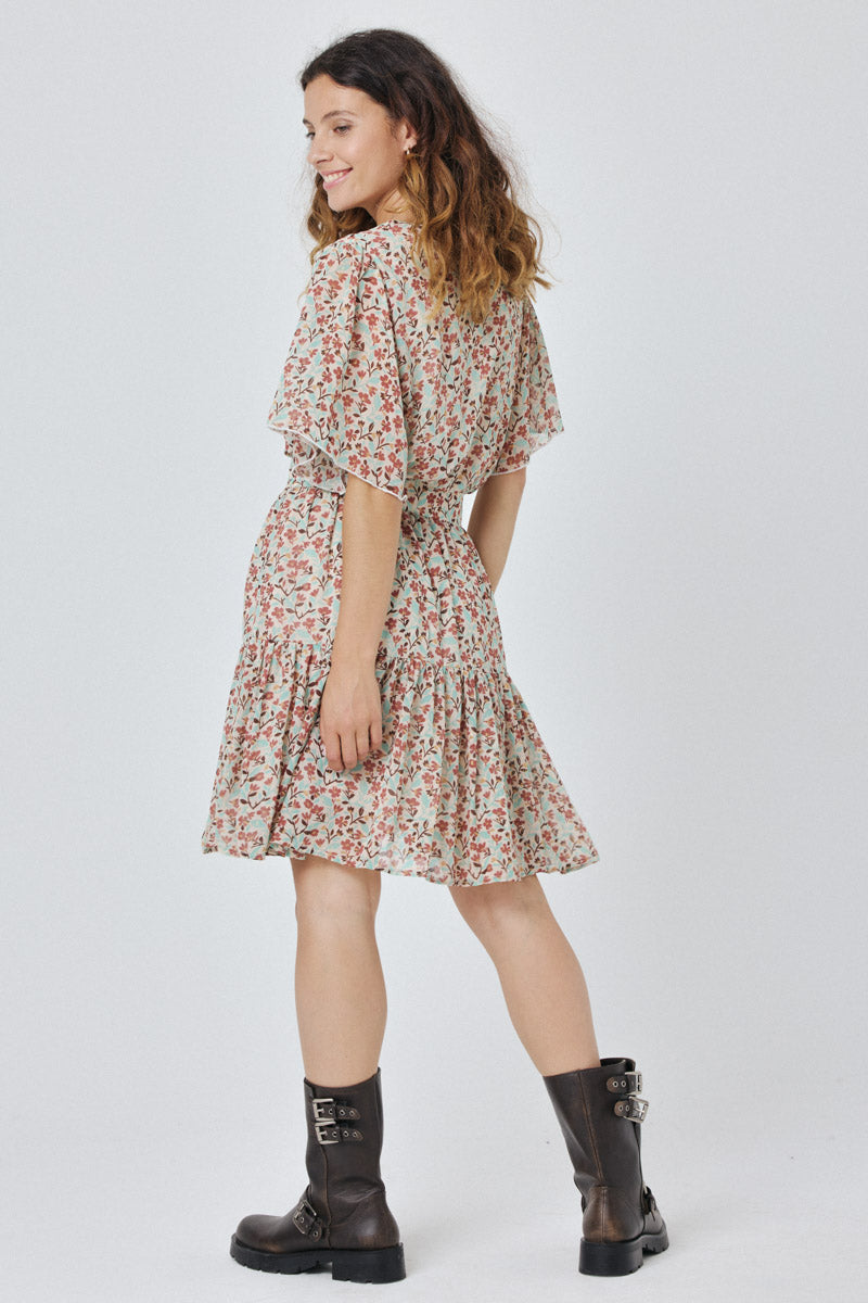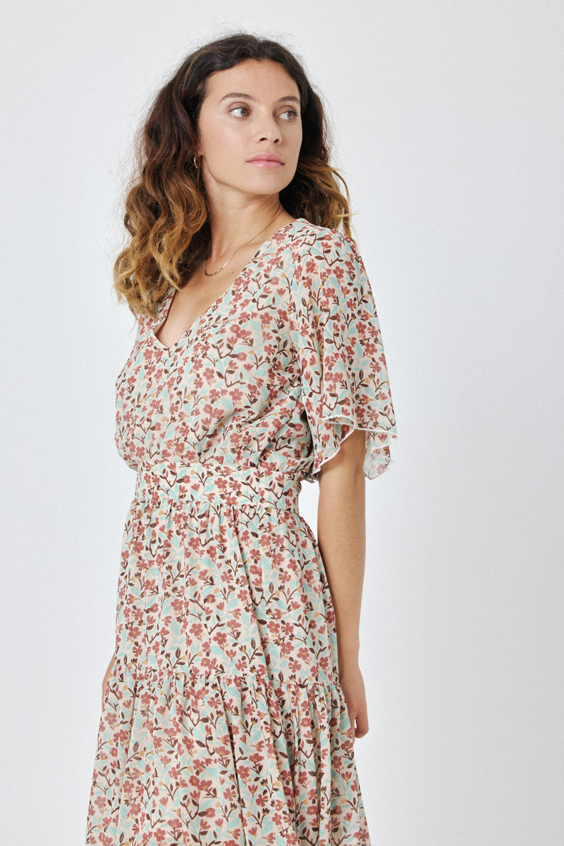 Robe à fleurs avec encolure en V, parfaite pour une touche de fraîcheur et de romantisme.
