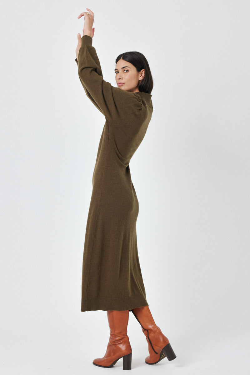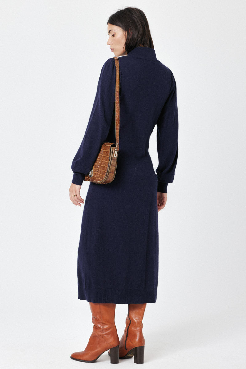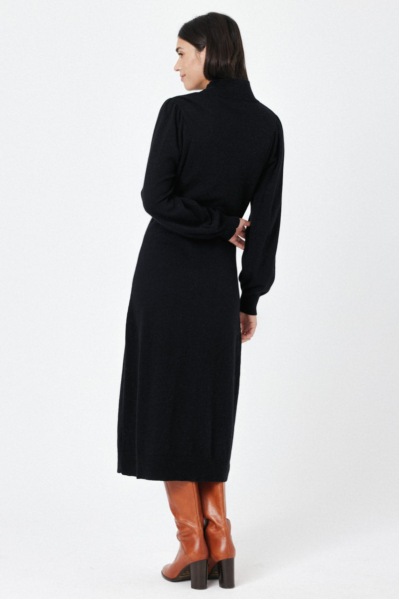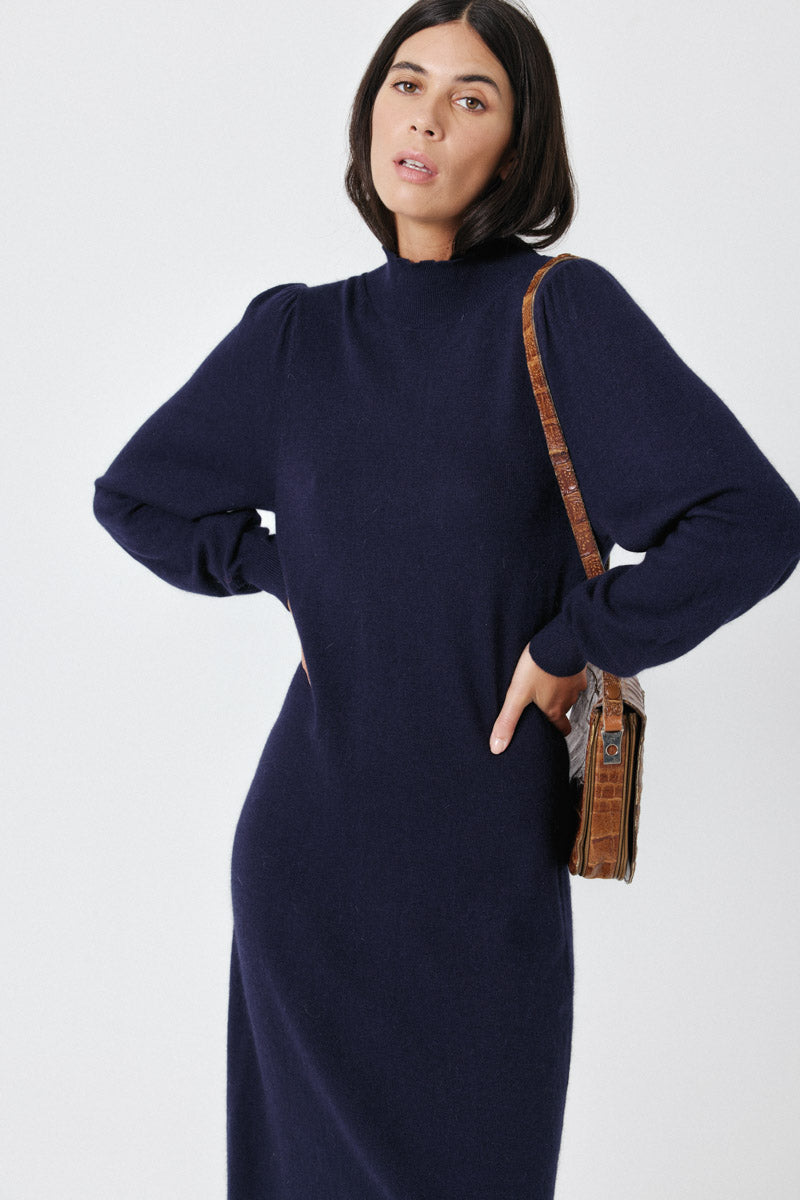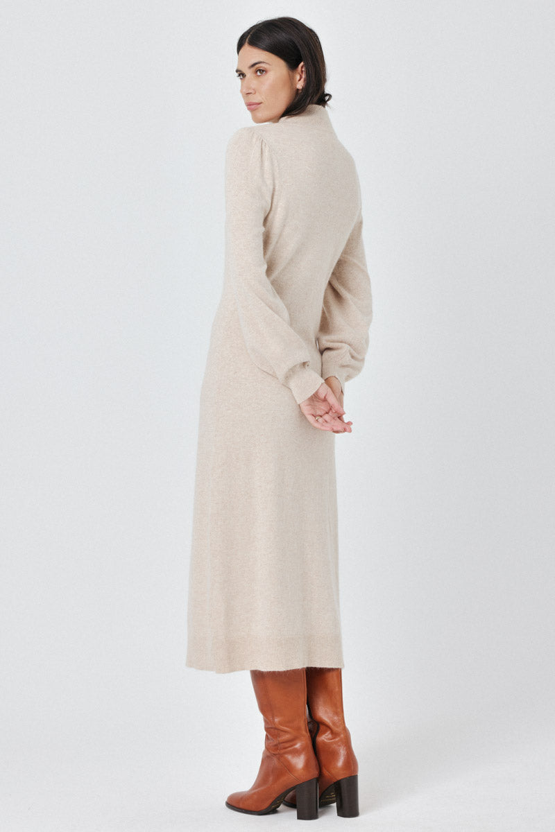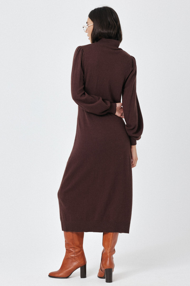 Robe en maille avec col montant et manches bouffantes, idéale pour l'automne et l'hiver.