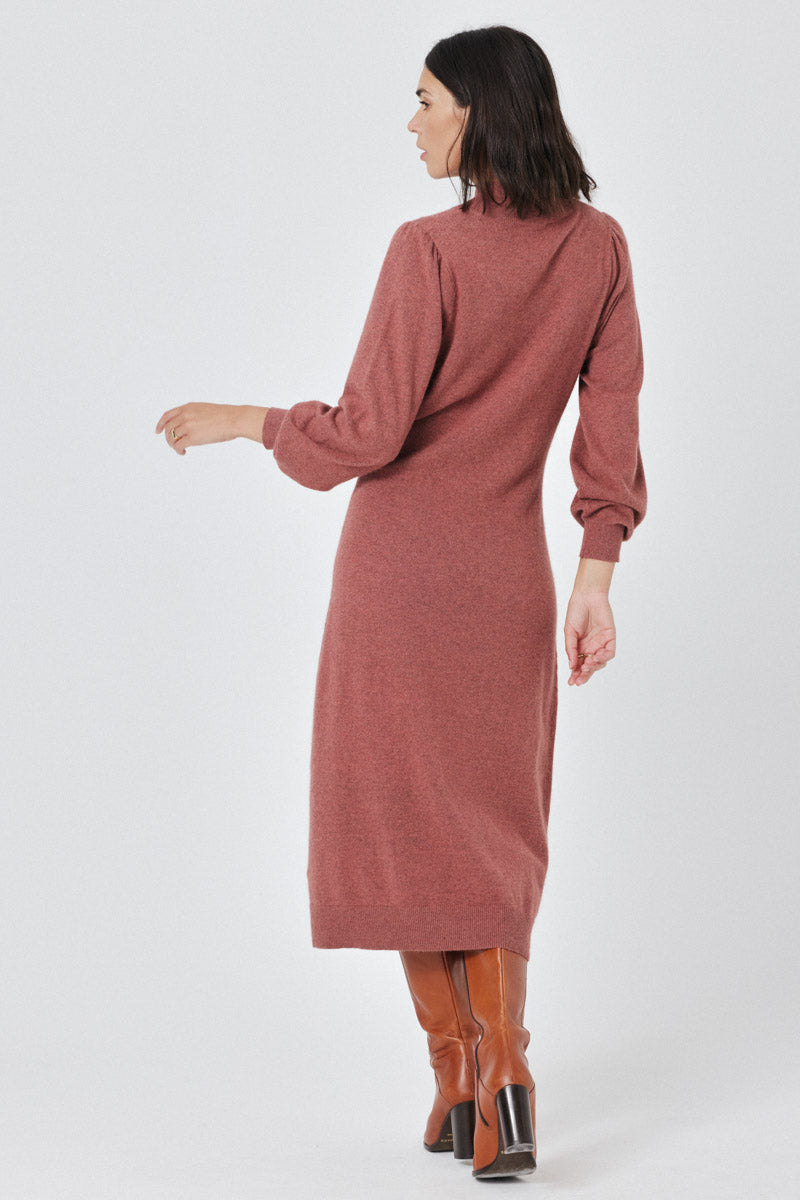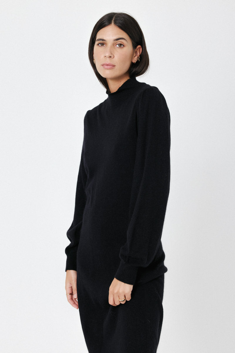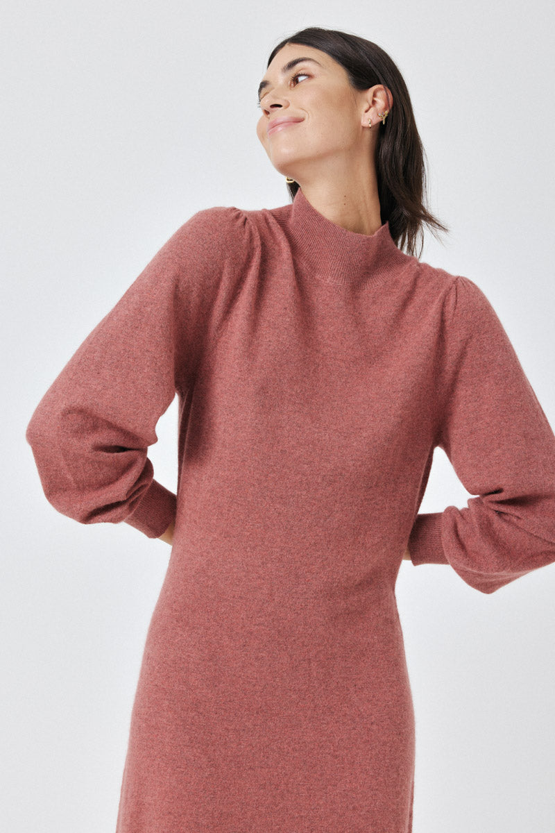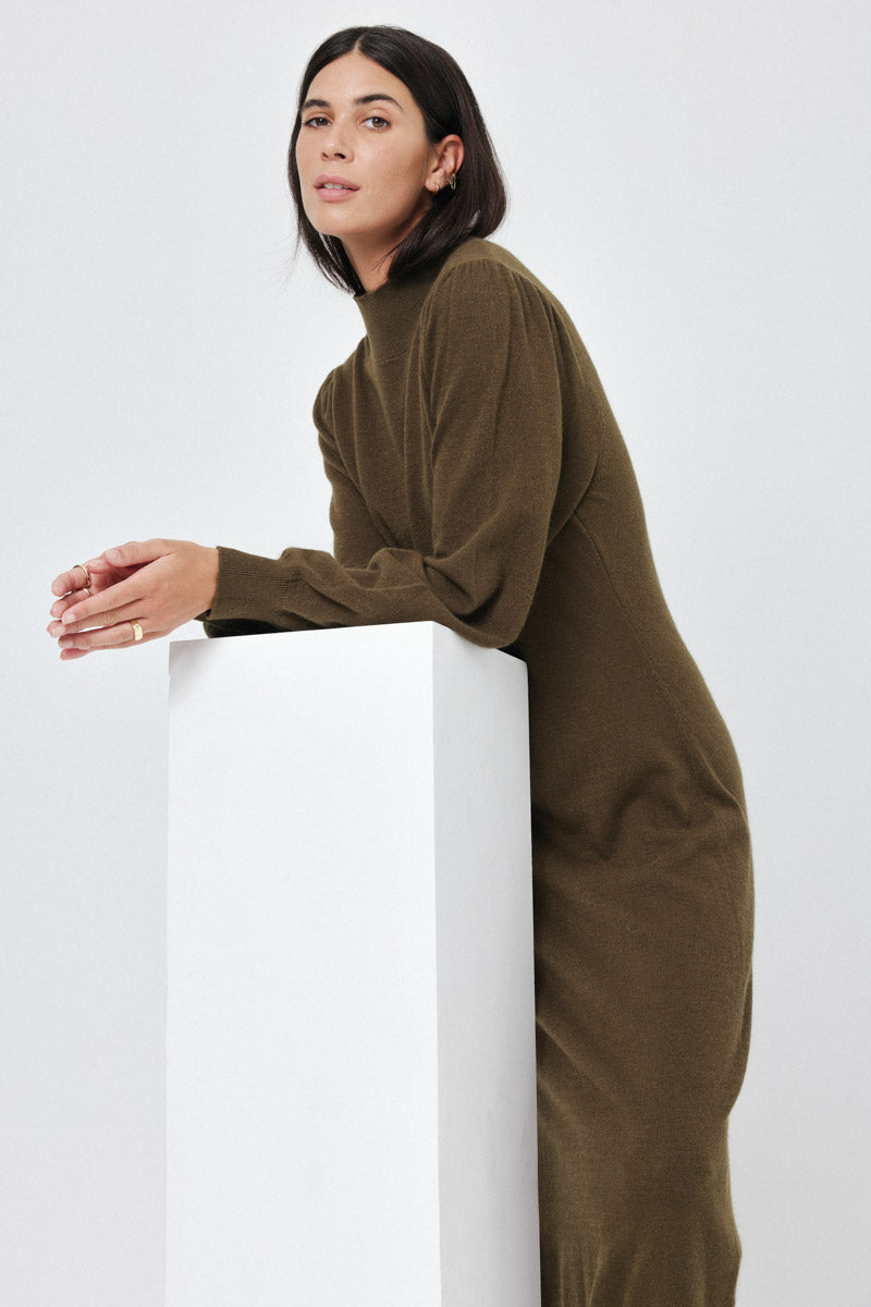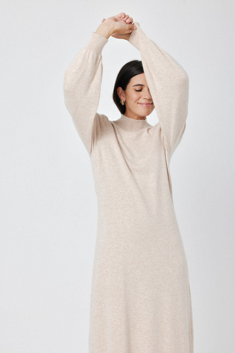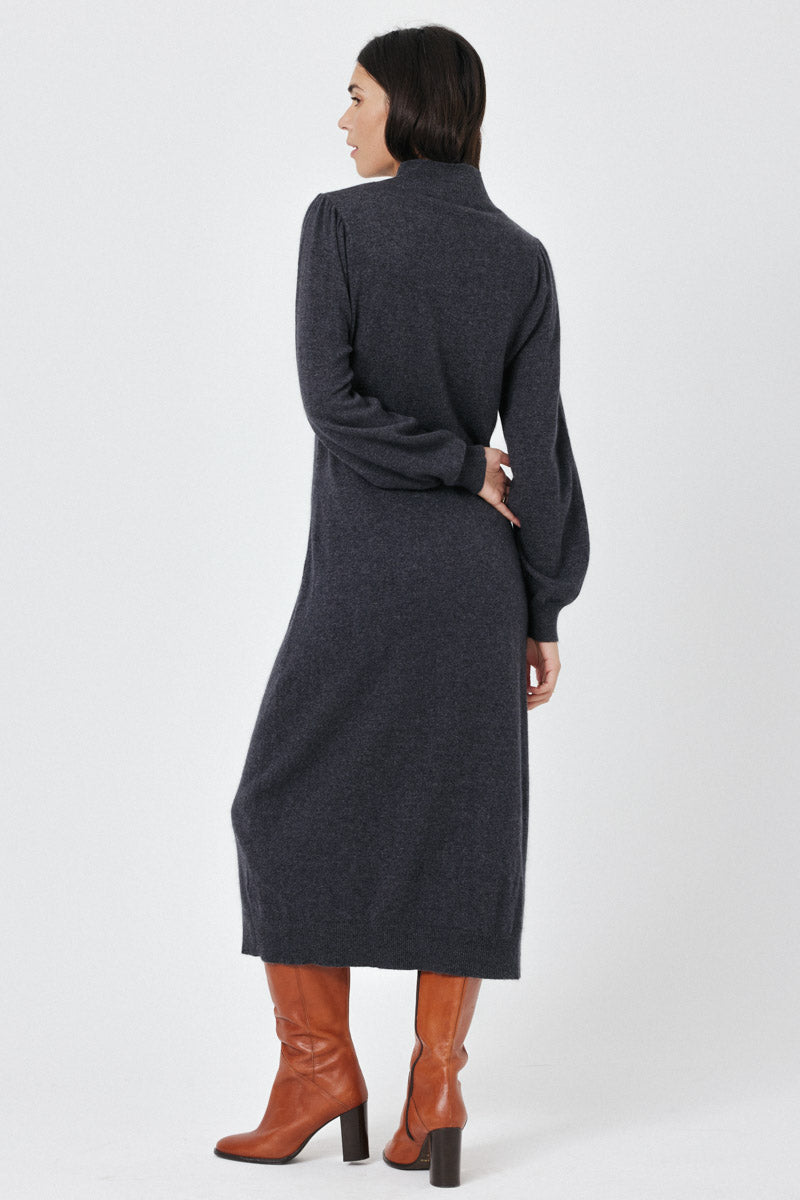 Robe en maille avec col montant et manches bouffantes, idéale pour l'automne et l'hiver.