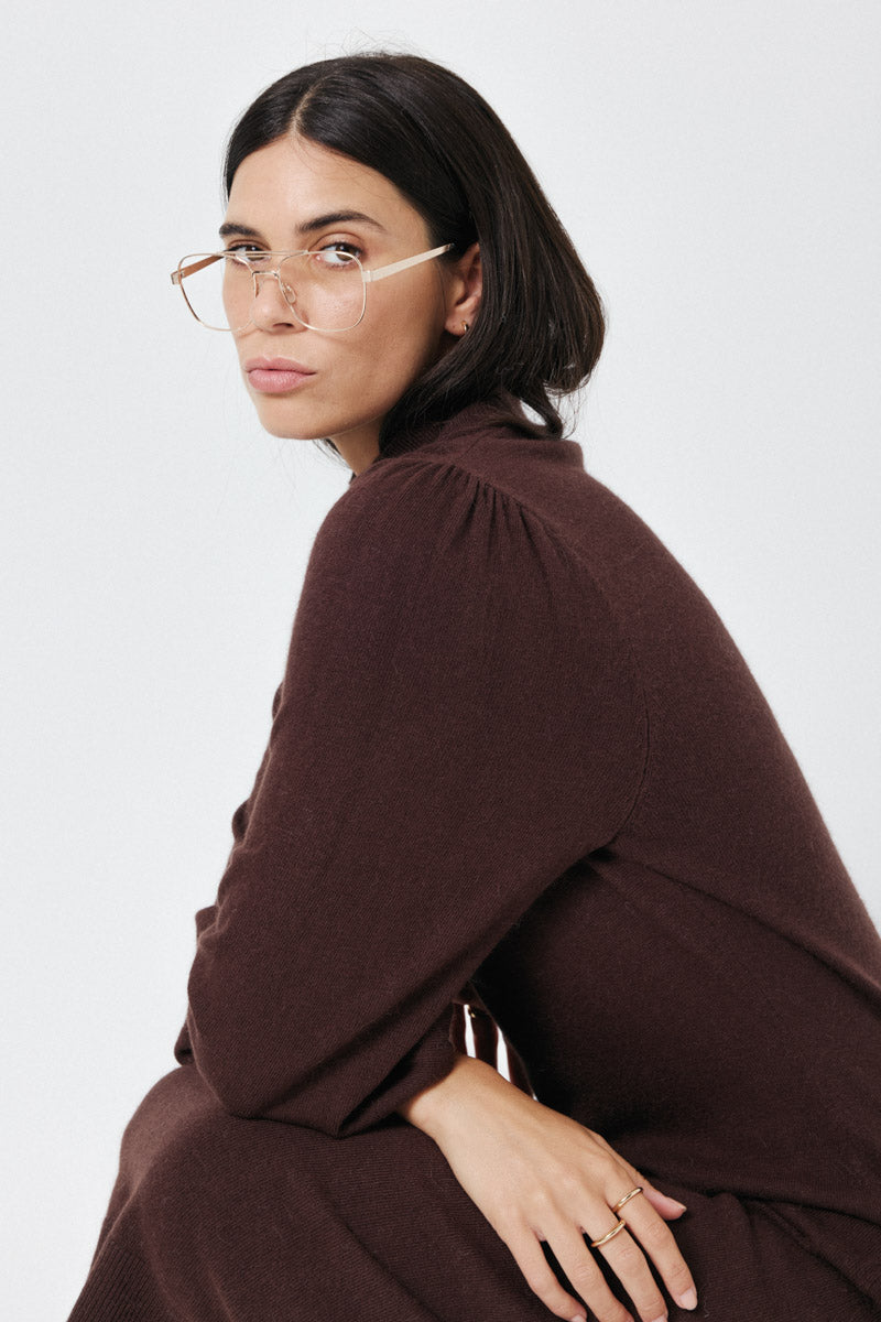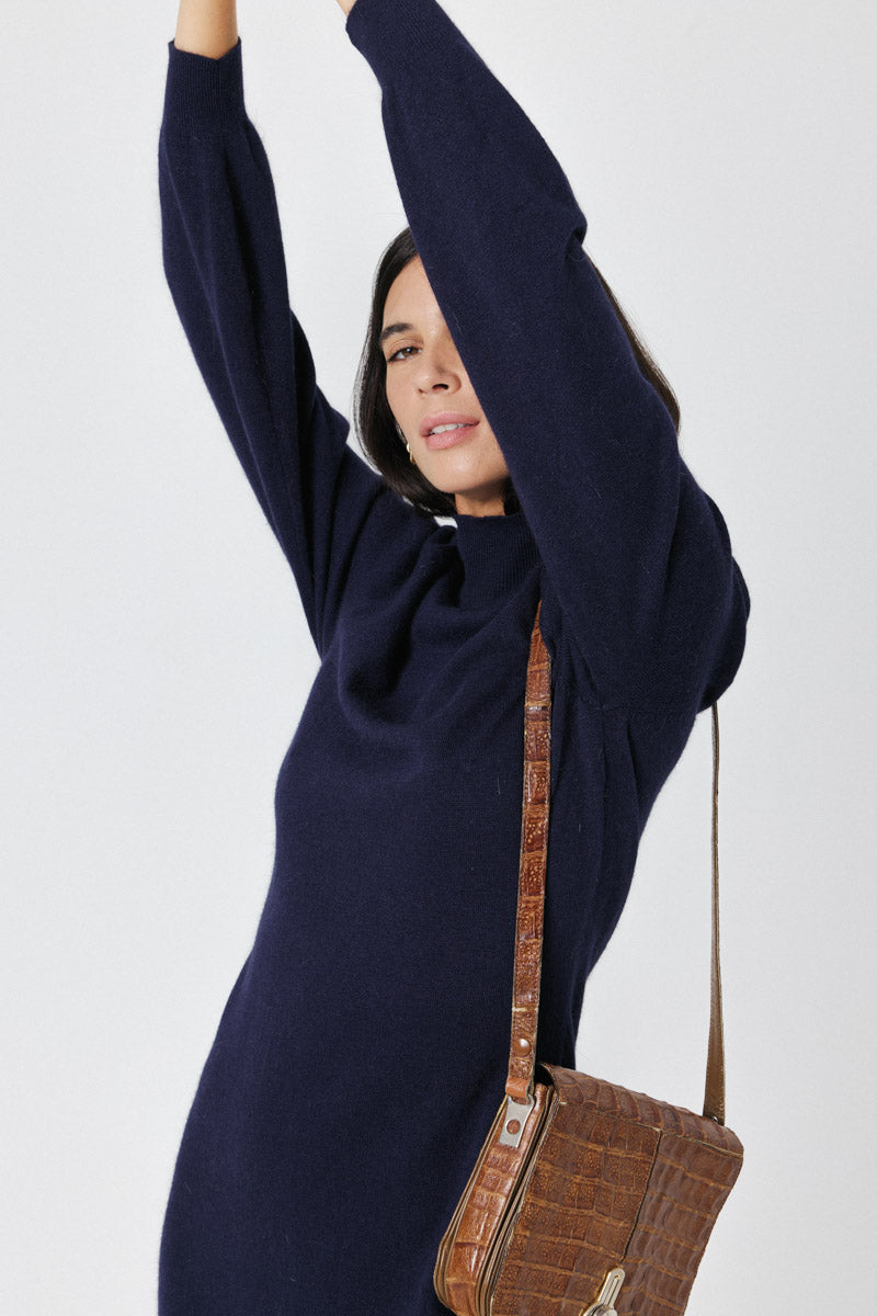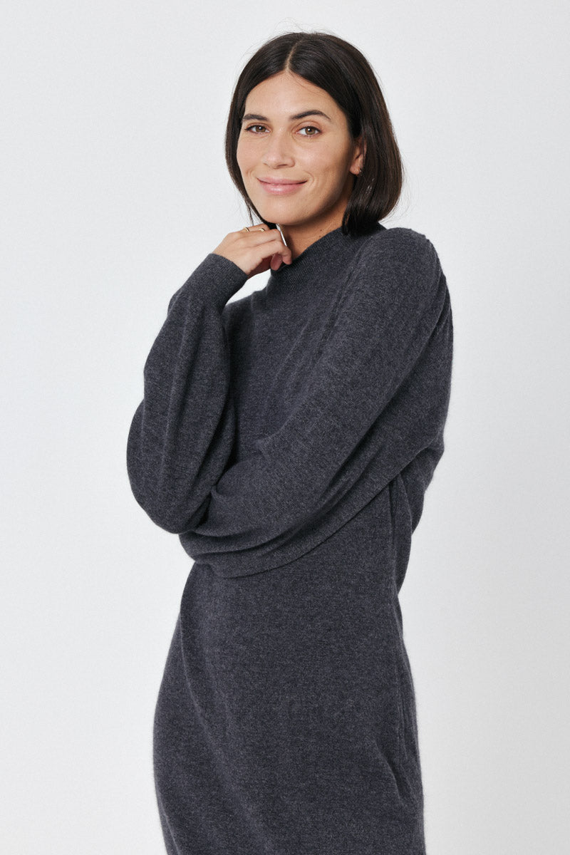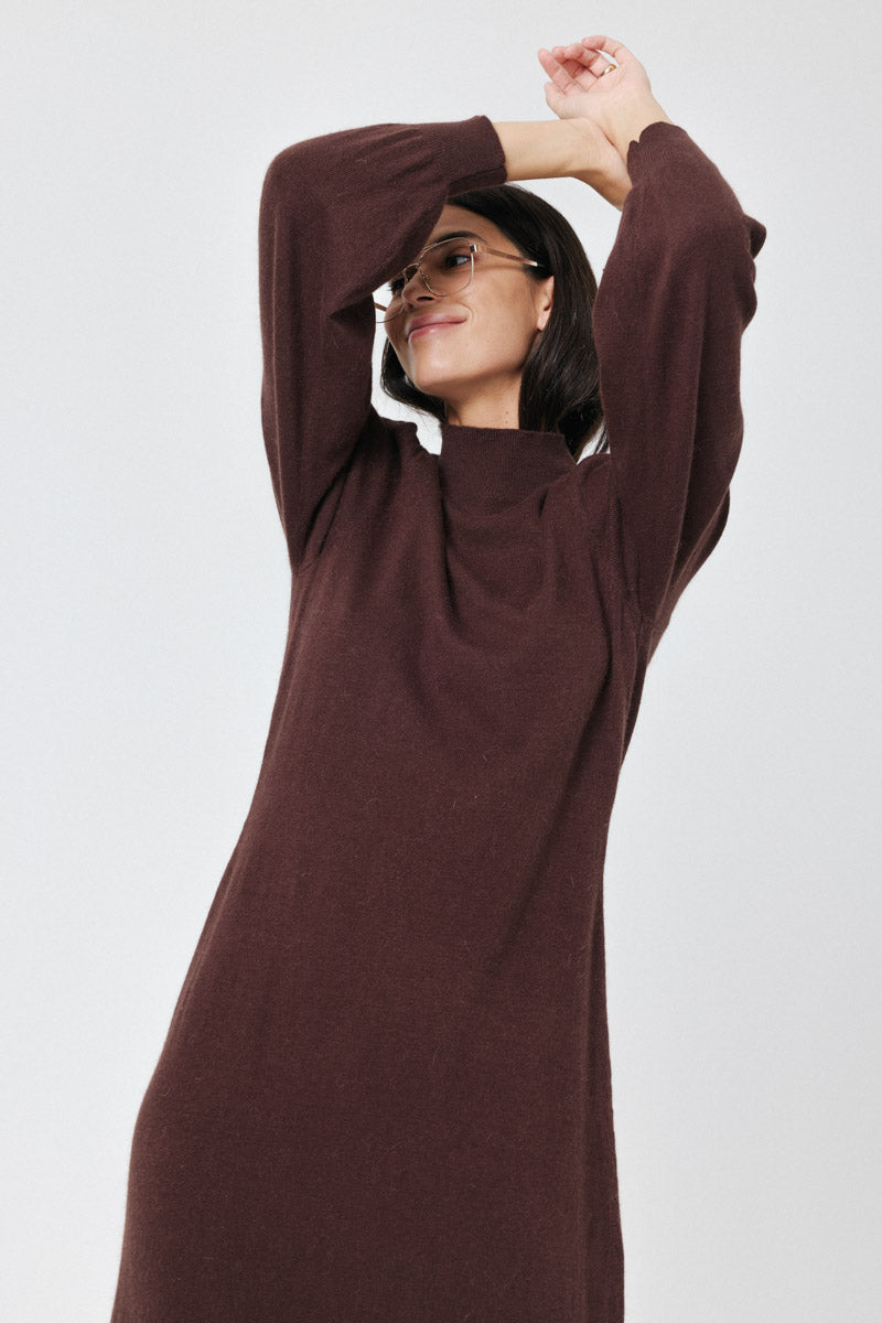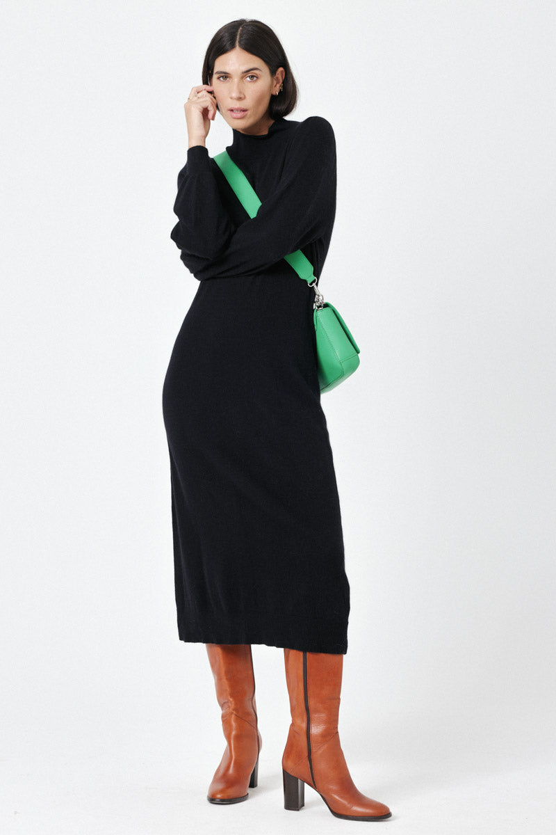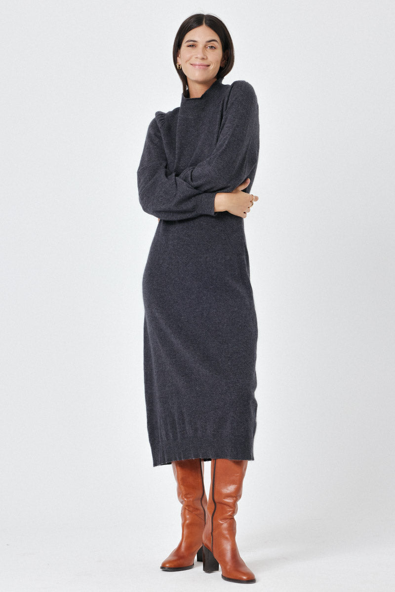 Robe en maille avec col montant et manches bouffantes, idéale pour l'automne et l'hiver.