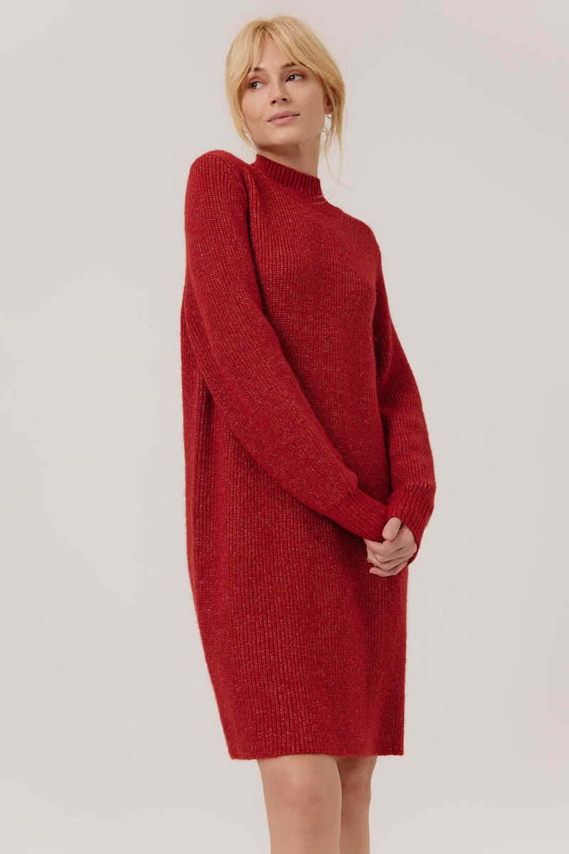 Robe pull en maille côtelée, col montant et coupe droite. Un essentiel hivernal confortable à porter avec des bottes.