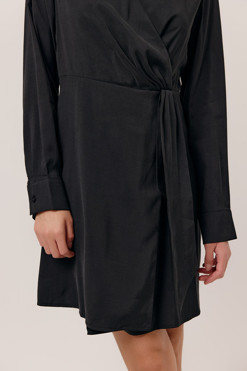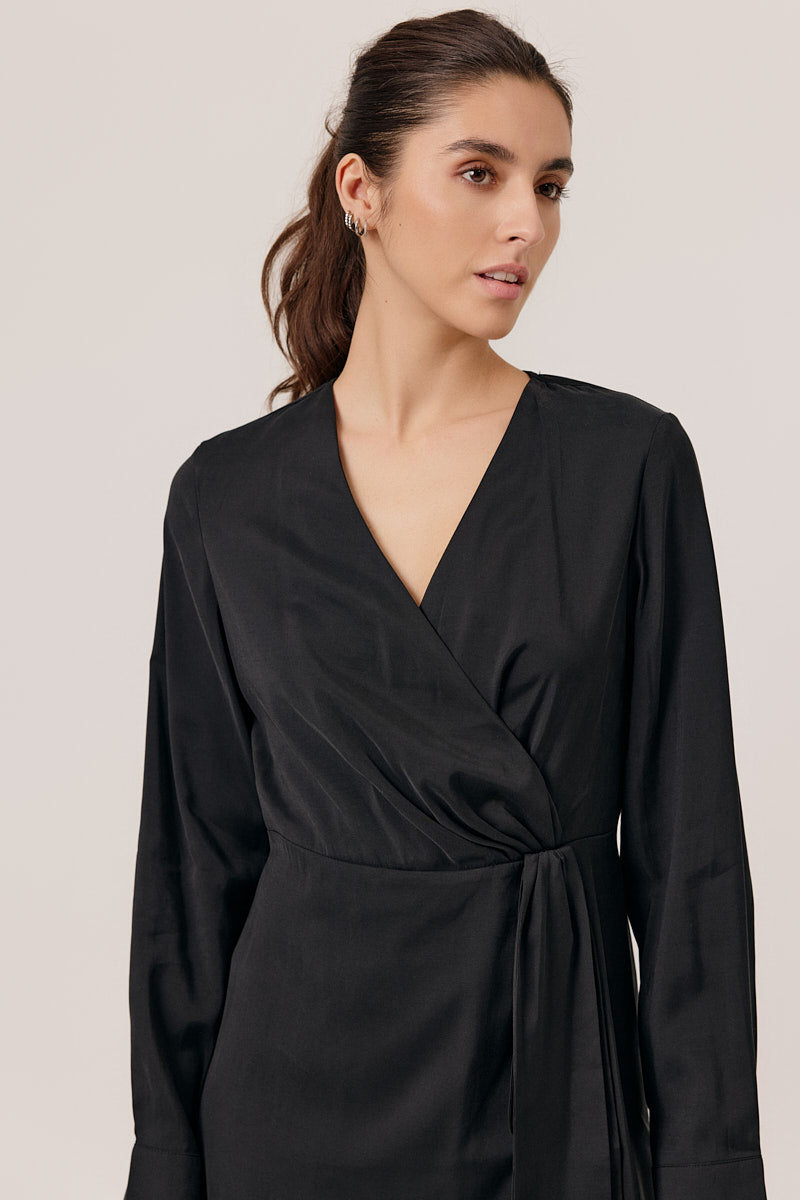 Robe noire fluide à coupe portefeuille, nouée à la taille, manches longues. Un classique féminin pour un style élégant sans effort.