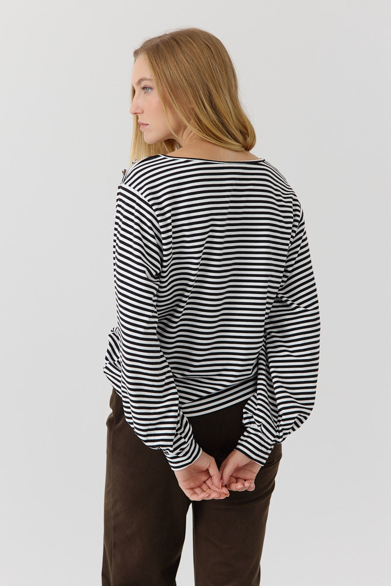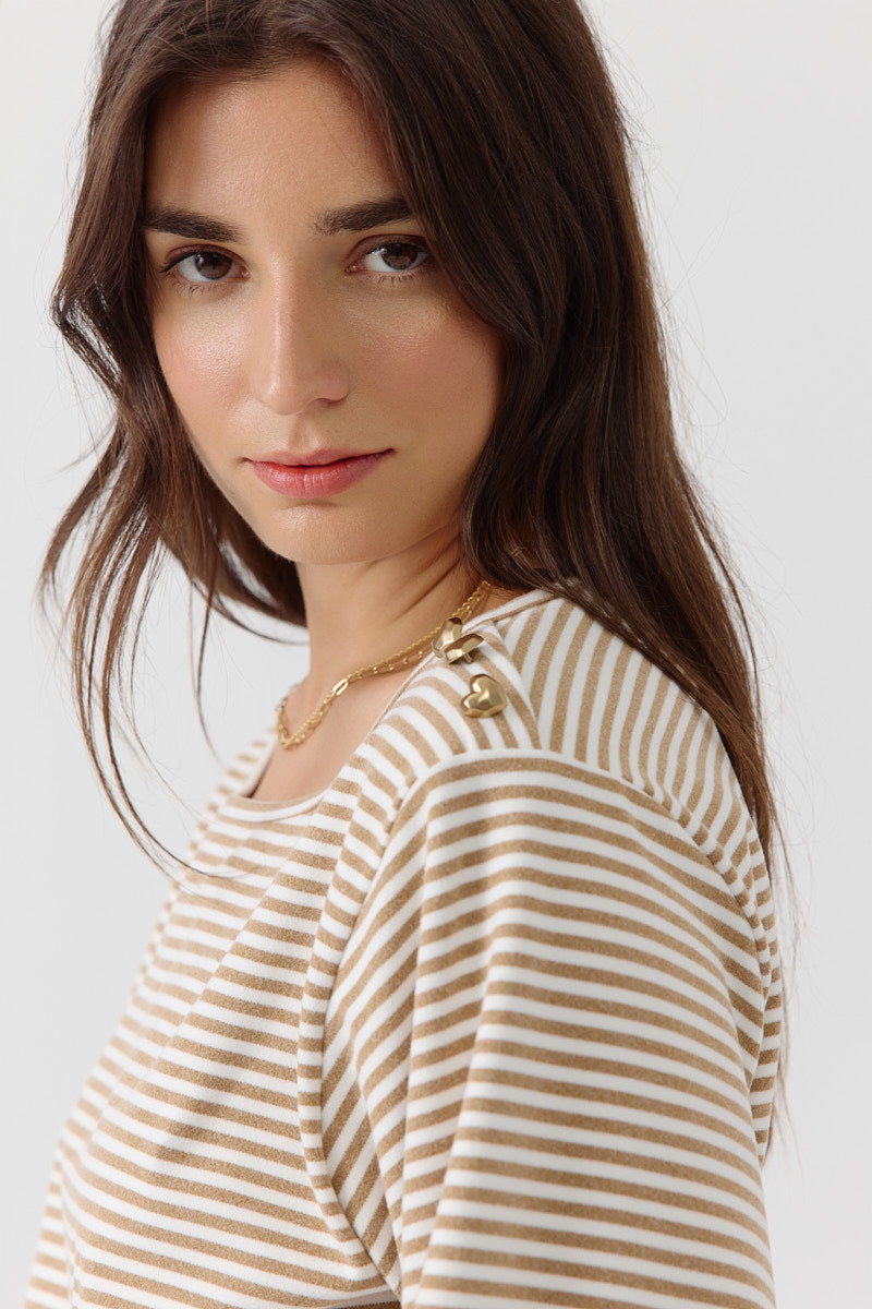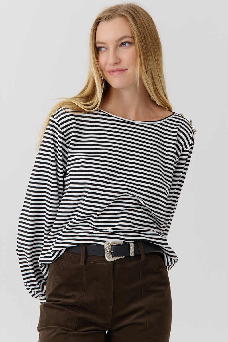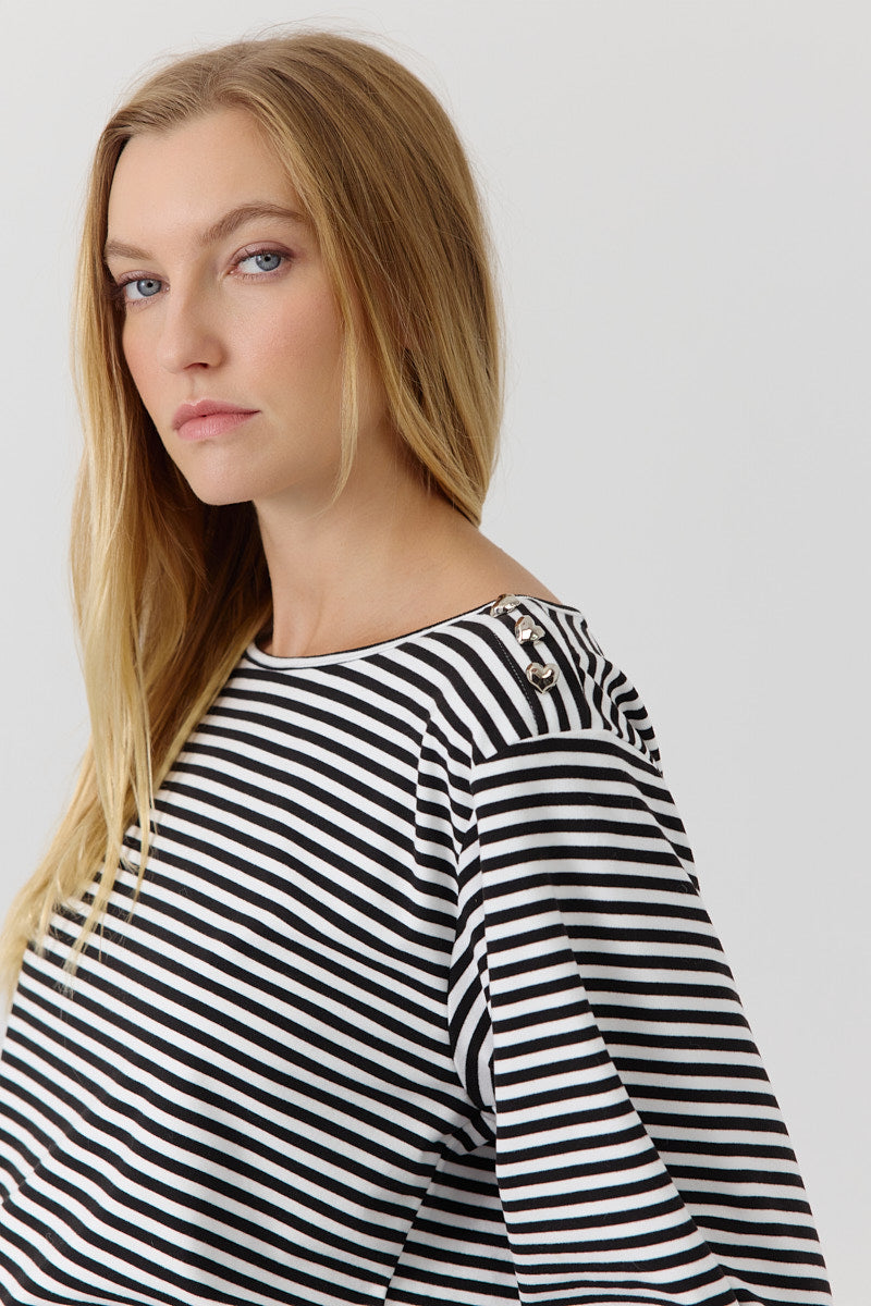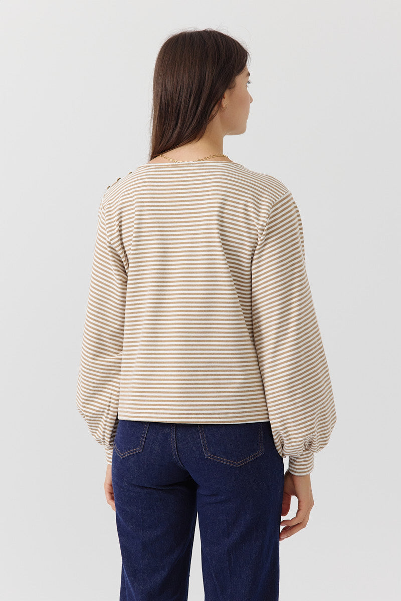 Sweat rayé avec manches bouffantes resserrées aux poignets et détail boutonné doré à l'épaule gauche.