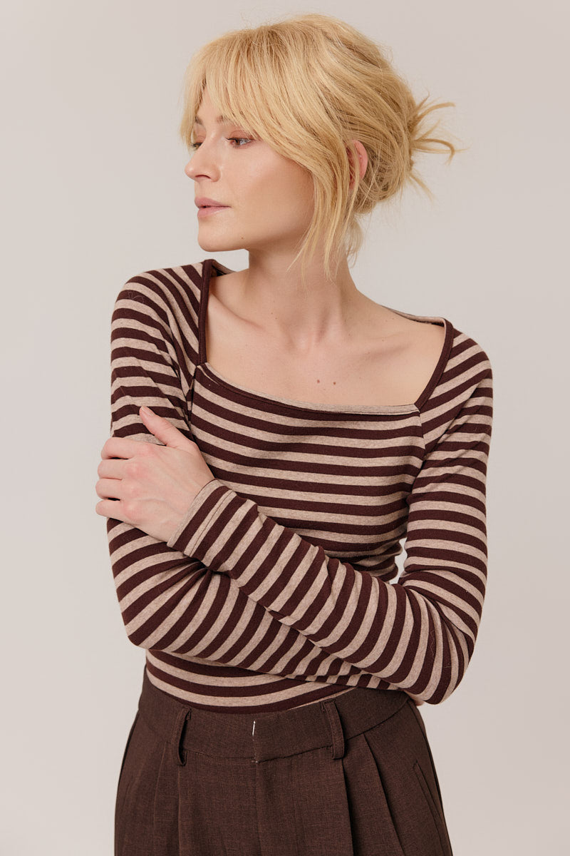 Tee-shirt rayé manches longues, col carré, ajusté.