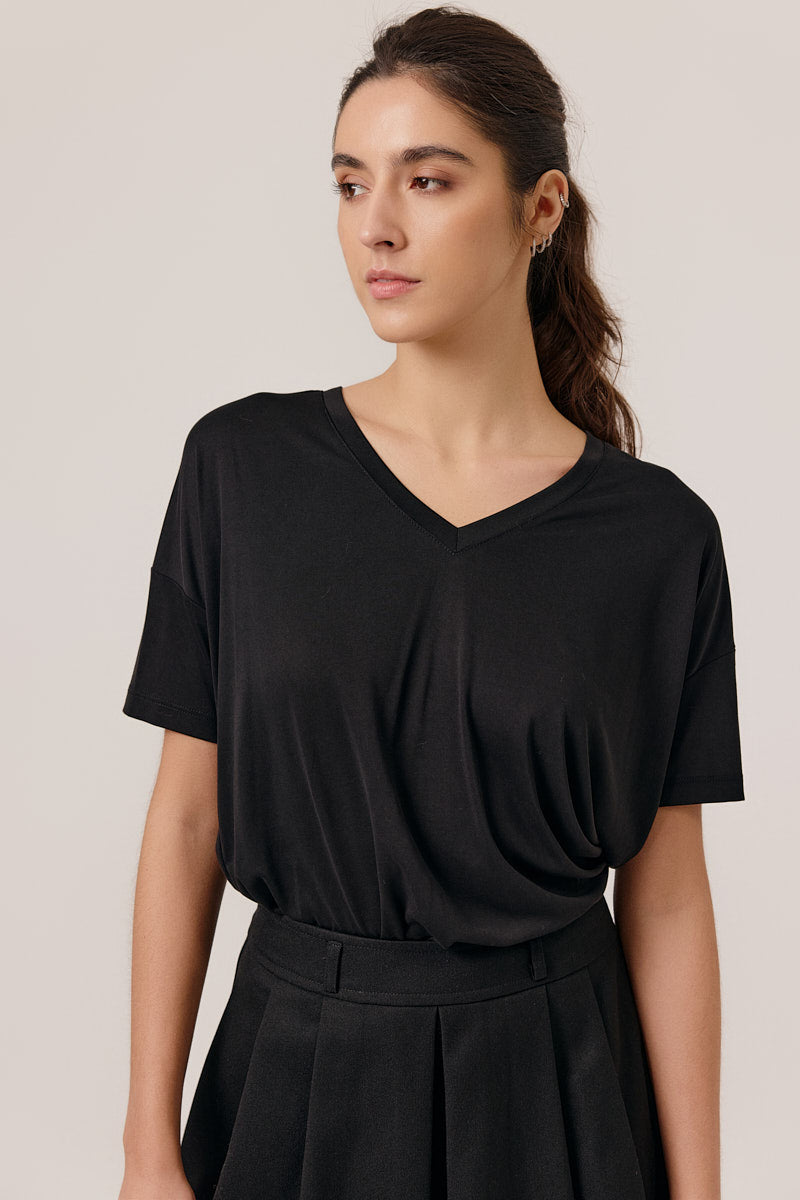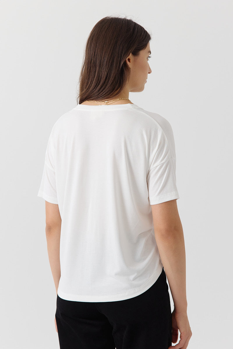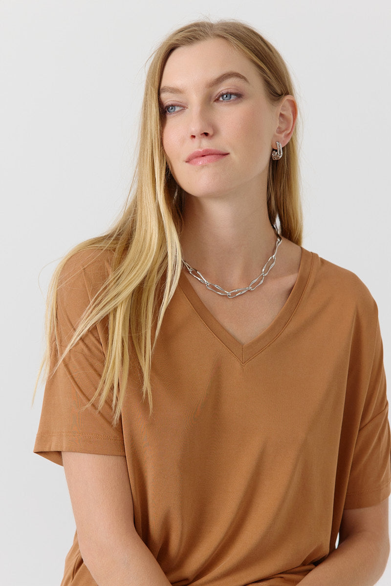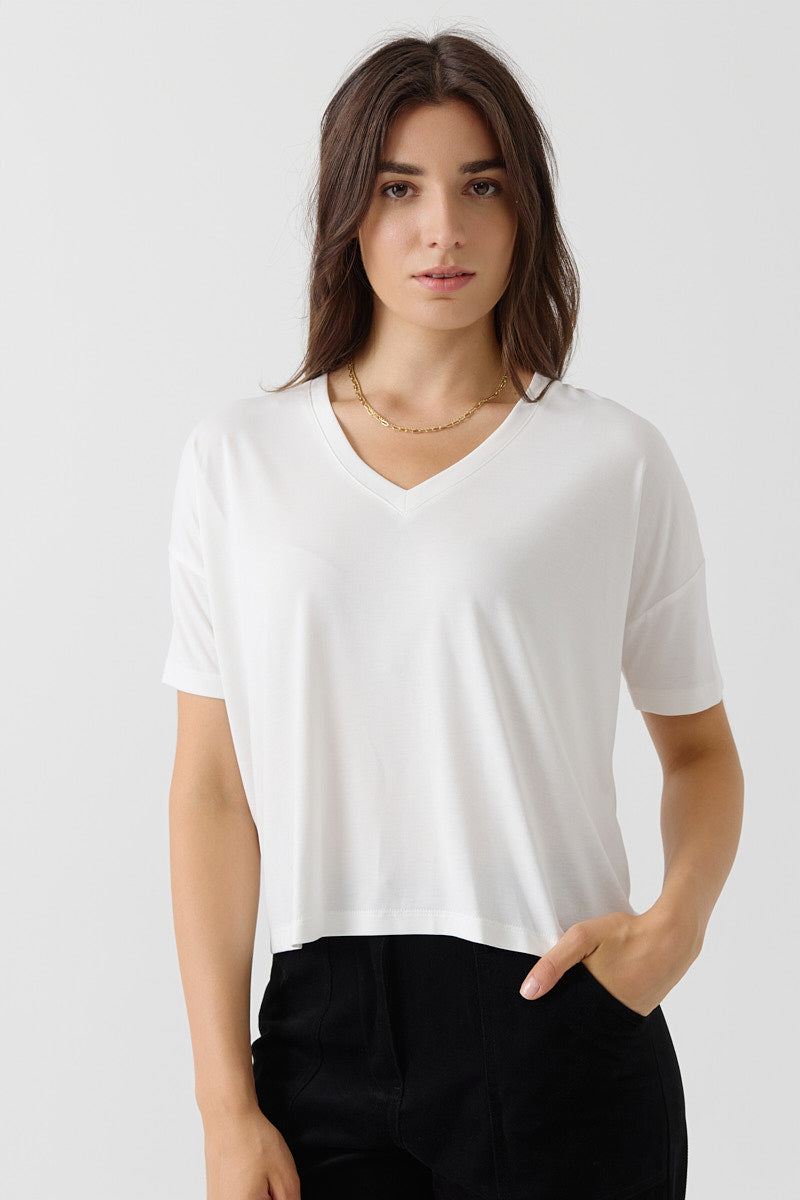 T-shirt col V à manches courtes en jersey fluide. Sa coupe droite et sa matière douce offrent un confort optimal au quotidien.