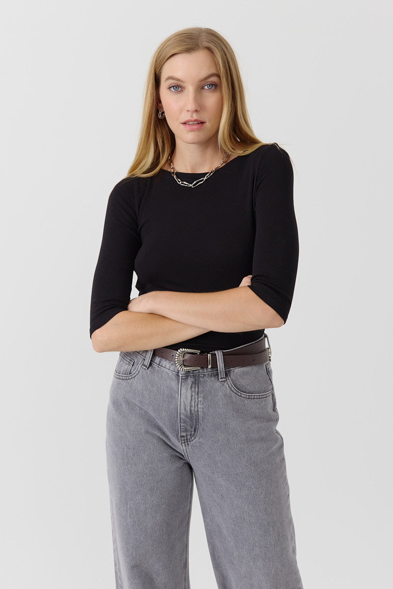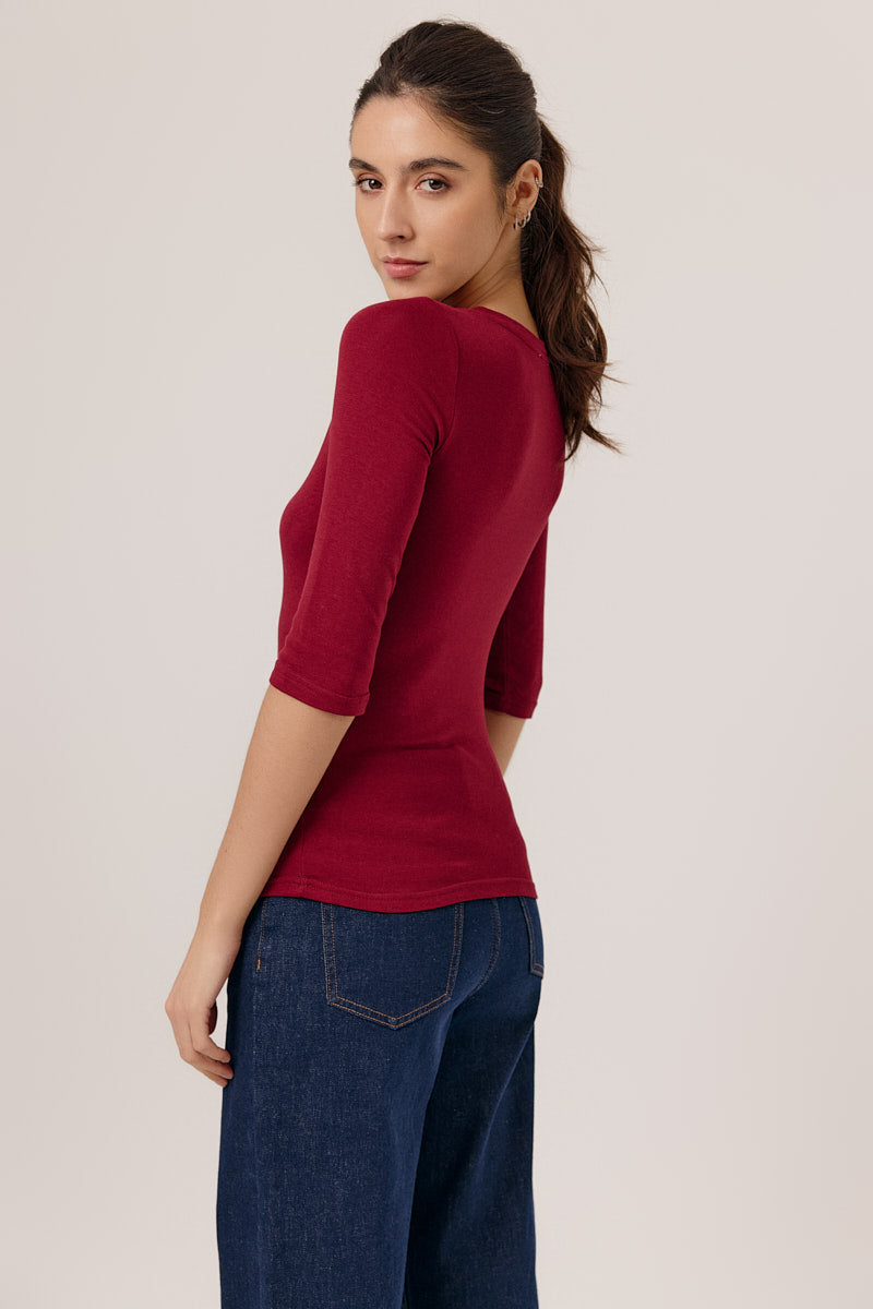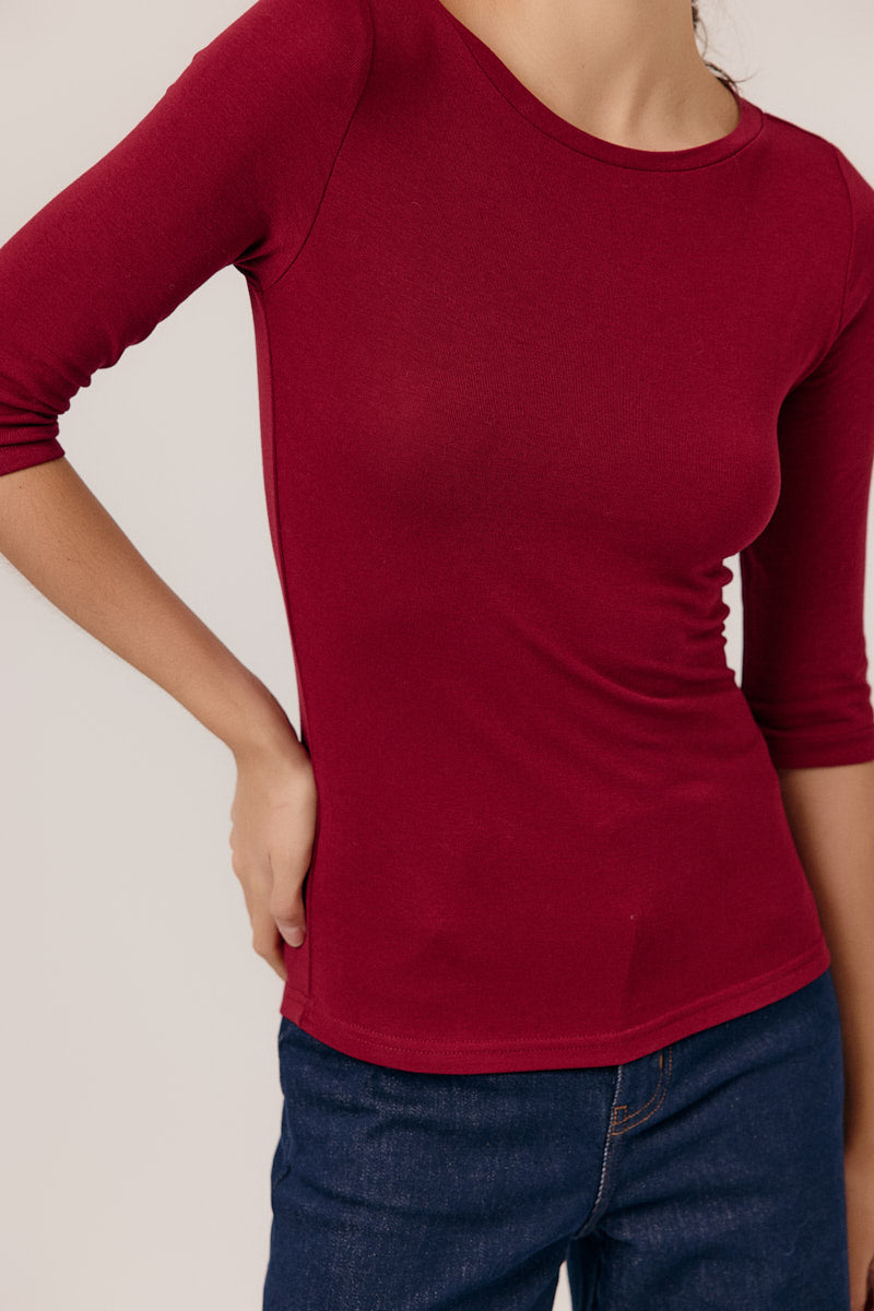 Top à manches ¾ et col rond. Coupe ajustée, en jersey stretch doux. Un basique élégant à porter seul ou sous un blazer.