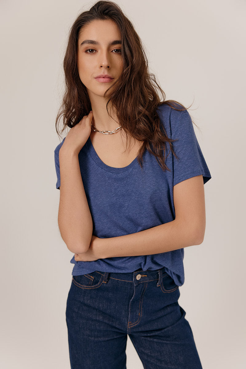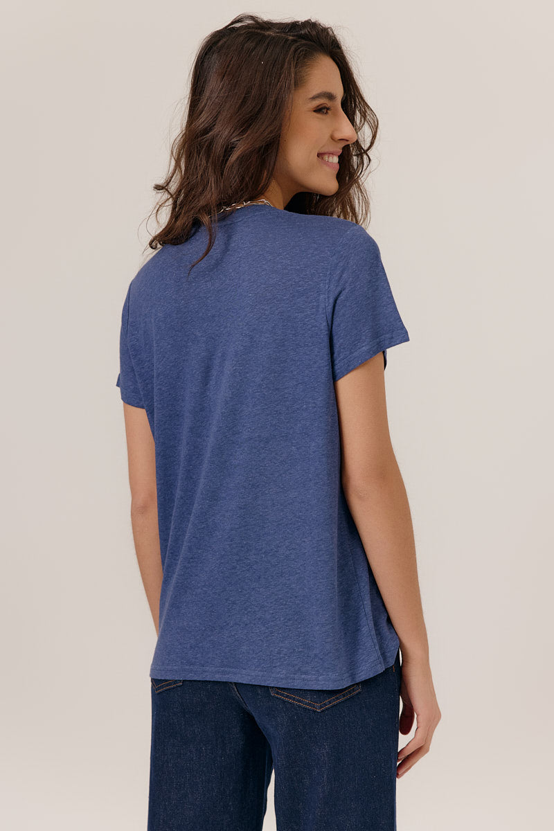 T-shirt col rond en jersey fluide, manches courtes retroussées, coupe droite avec un tombé naturel. Encolure dégagée et matière douce. Coupe normale.