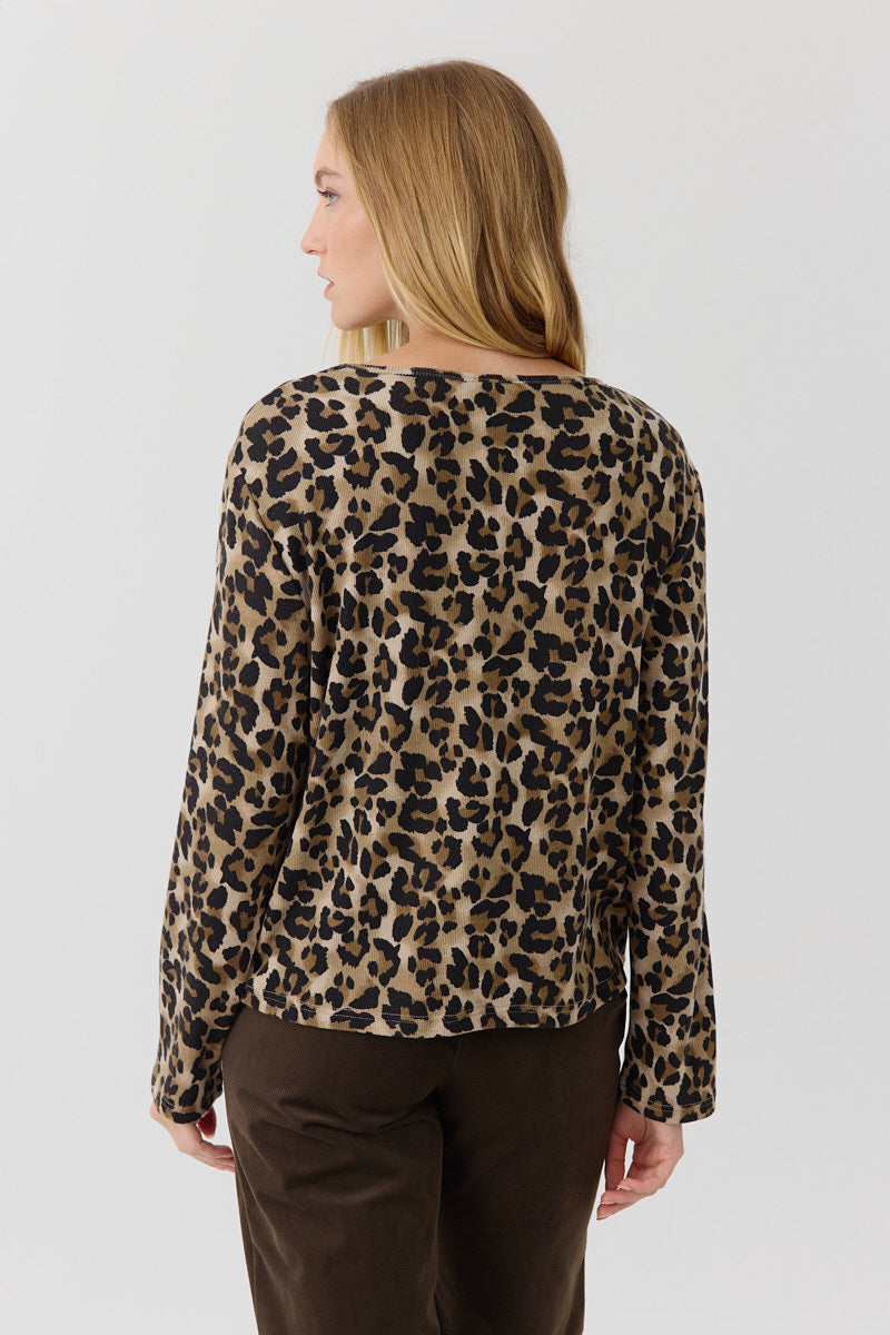 T-shirt imprimé léopard en maille côtelée souple. Coupe droite, col rond et manches longues, pour un look audacieux et confortable.