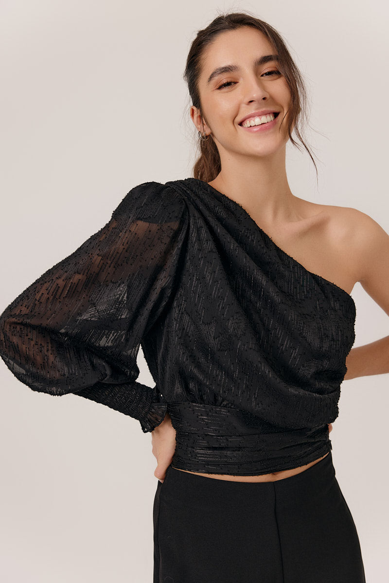 Top asymétrique à une manche longue bouffante. Effet drapé sur le buste et smocks au poignet. Matière légère et texturée. Coupe ajustée à la taille.