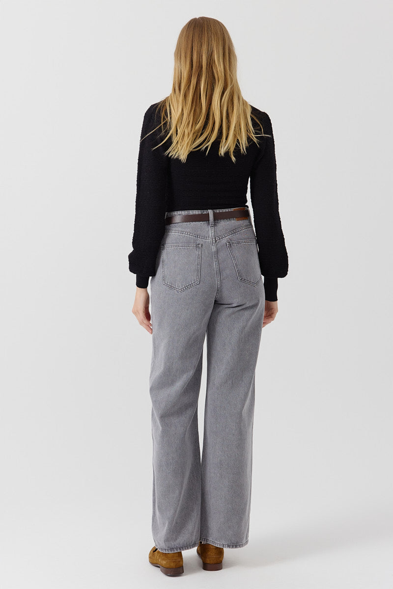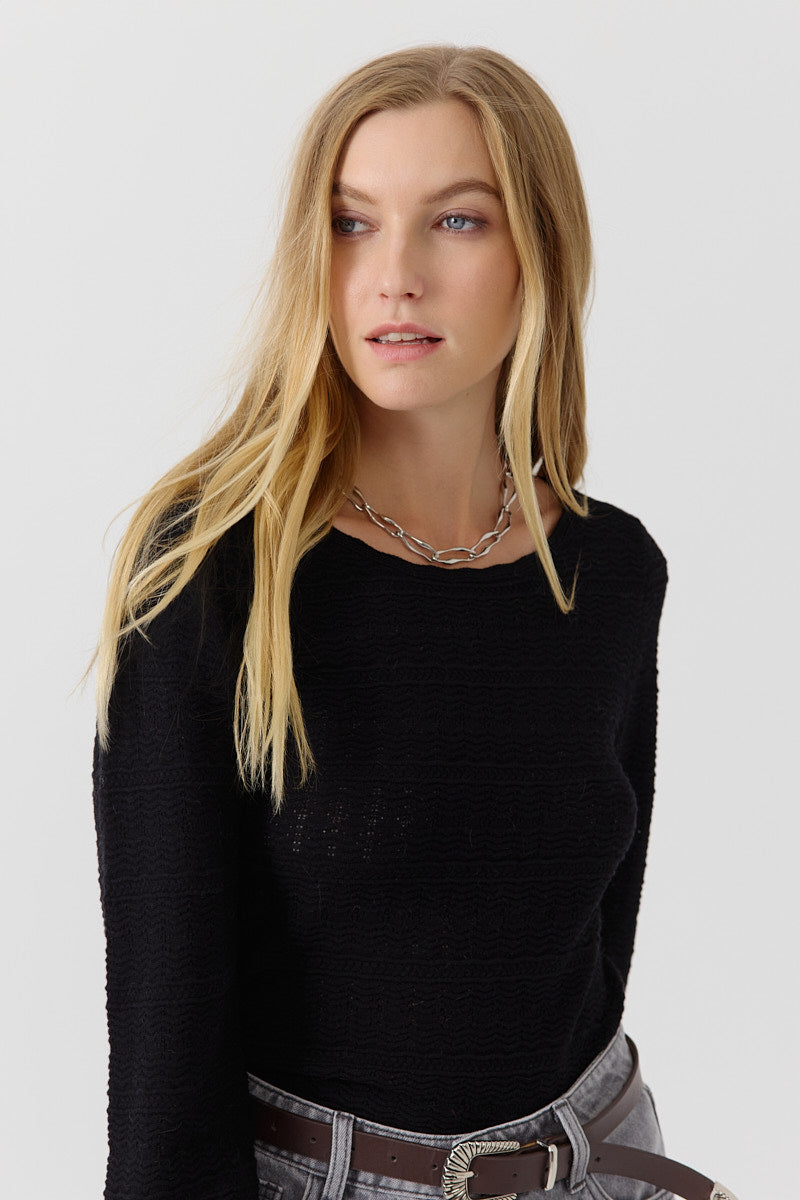 Pull fin à maille ajourée, doté de manches longues et de finitions côtelées. Sa coupe ajustée et son détail travaillé apportent une touche délicate et féminine à vos tenues du quotidien.