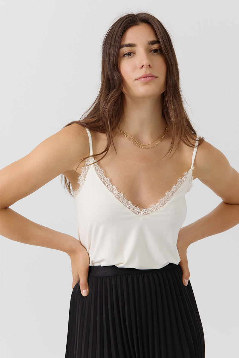 Top fluide à fines bretelles et encolure V. Détail dentelle délicat sur le décolleté. Coupe droite avec tombé fluide. Coupe normale.