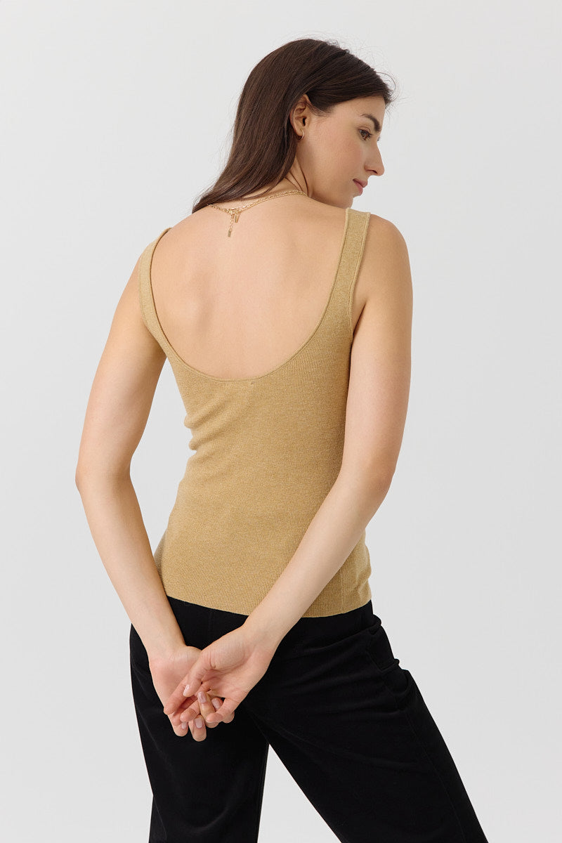 Débardeur côtelé à larges bretelles. Encolure arrondie dégagée, matière stretch avec léger effet pailleté. Coupe ajustée qui épouse le buste. Coupe près du corps.