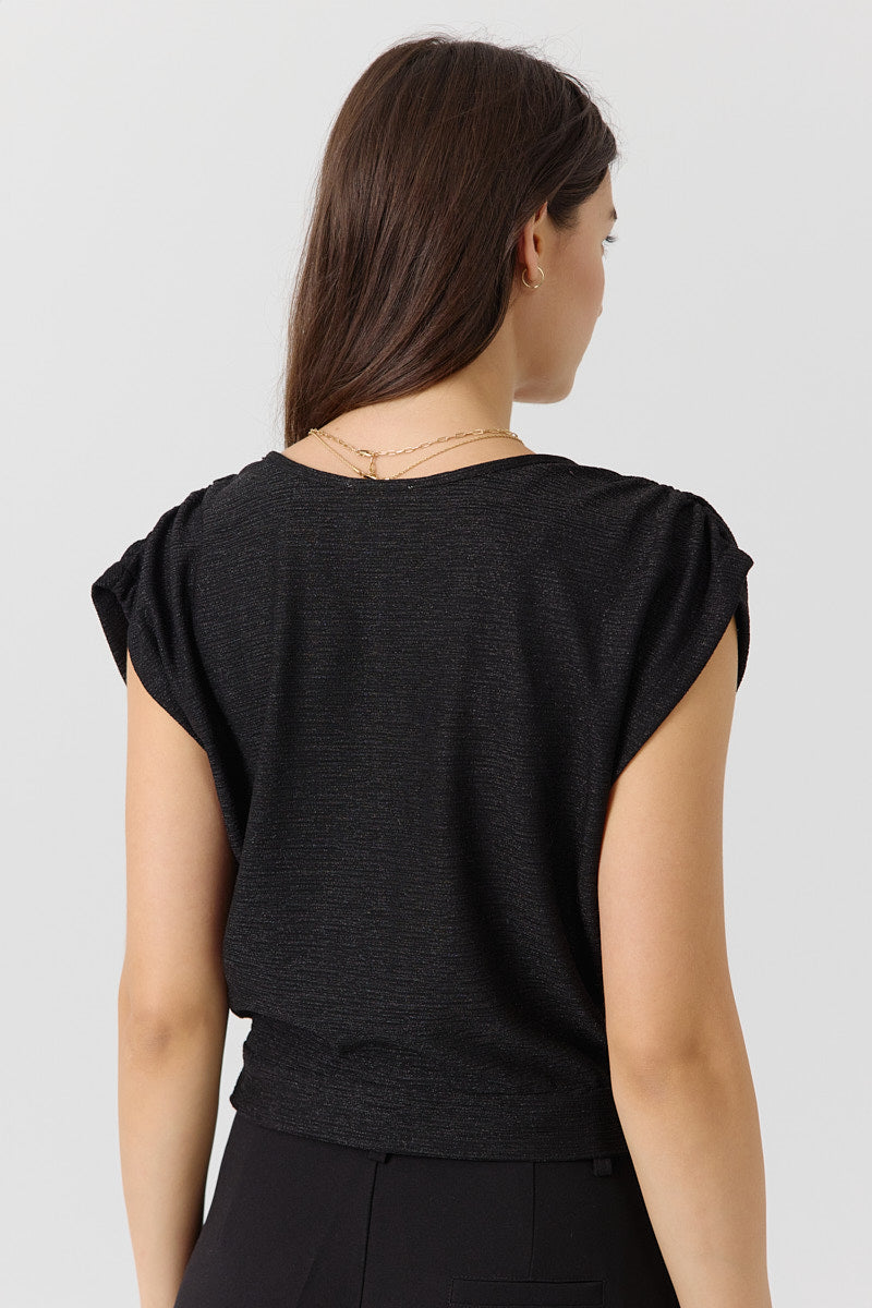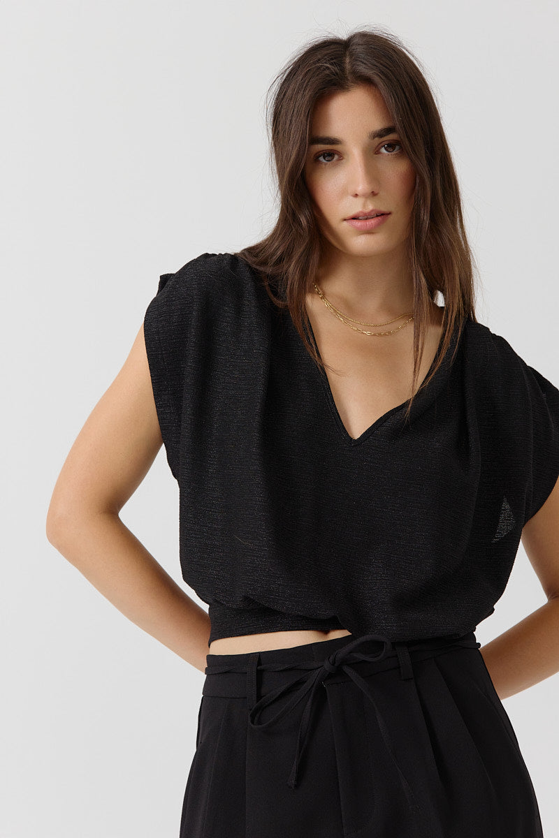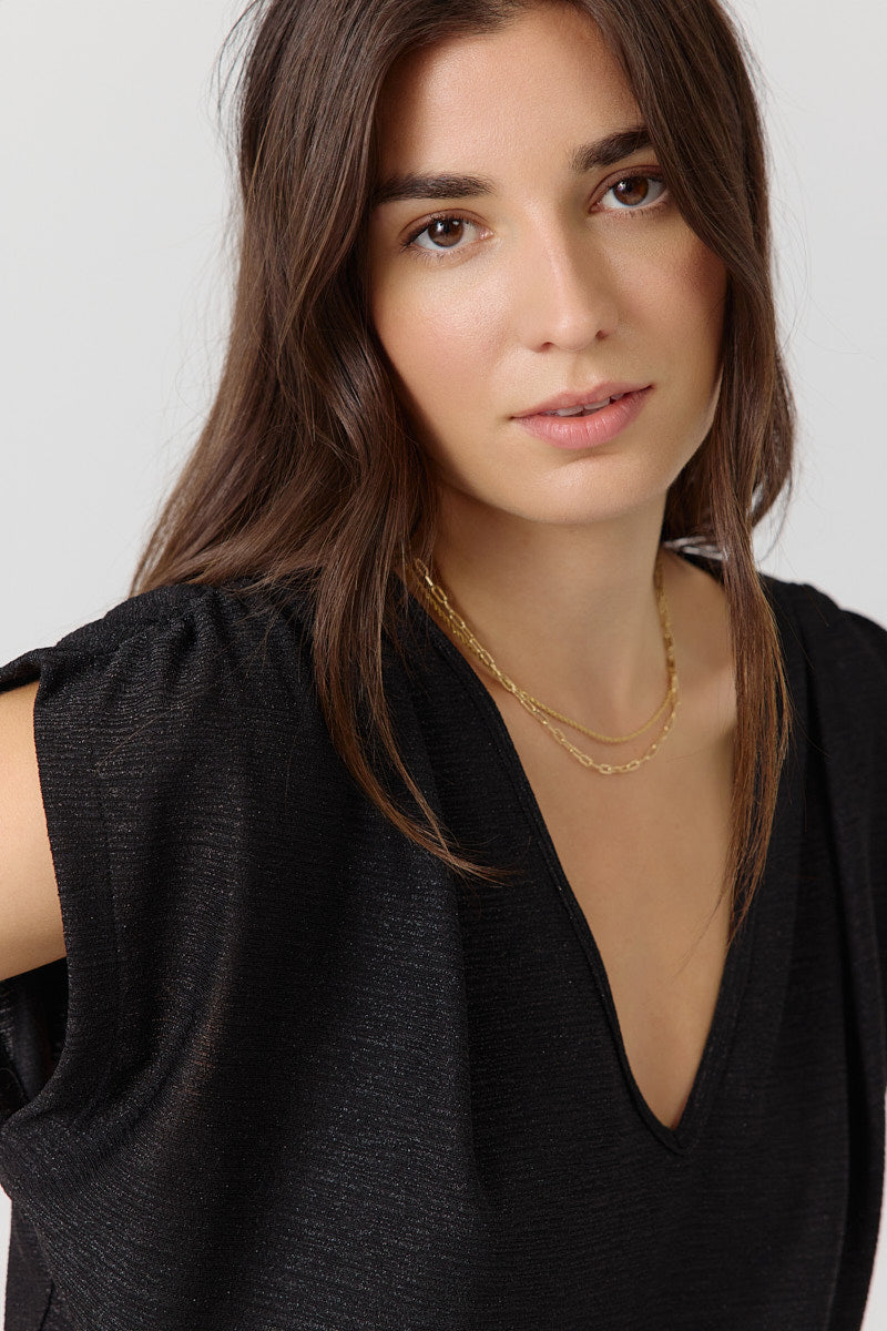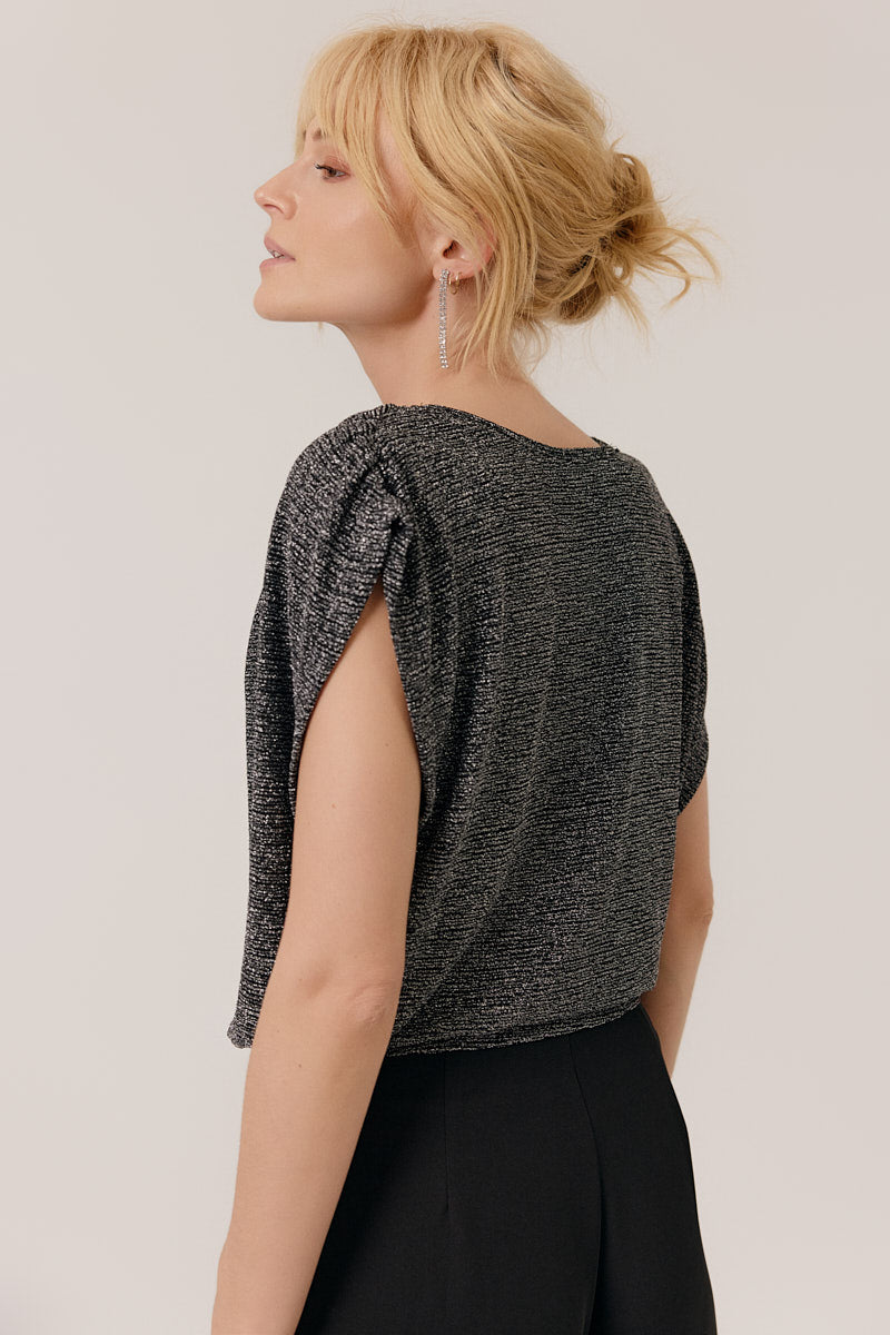 Top sans manches en maille métallisée argentée, coupe fluide et col V plongeant. Parfait pour illuminer vos soirées.