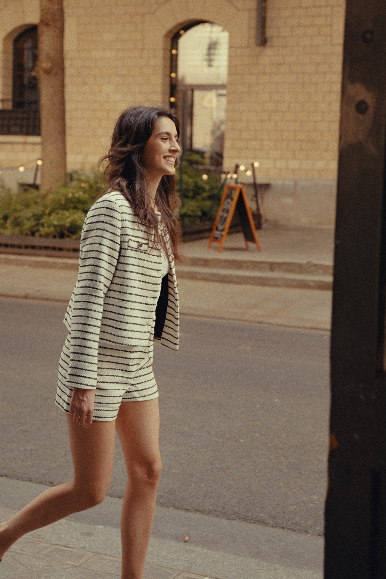 Une veste courte à rayures texturées. Les boutons contrastants ajoutent une touche sophistiquée à ce modèle facile à assortir pour un look élégant.