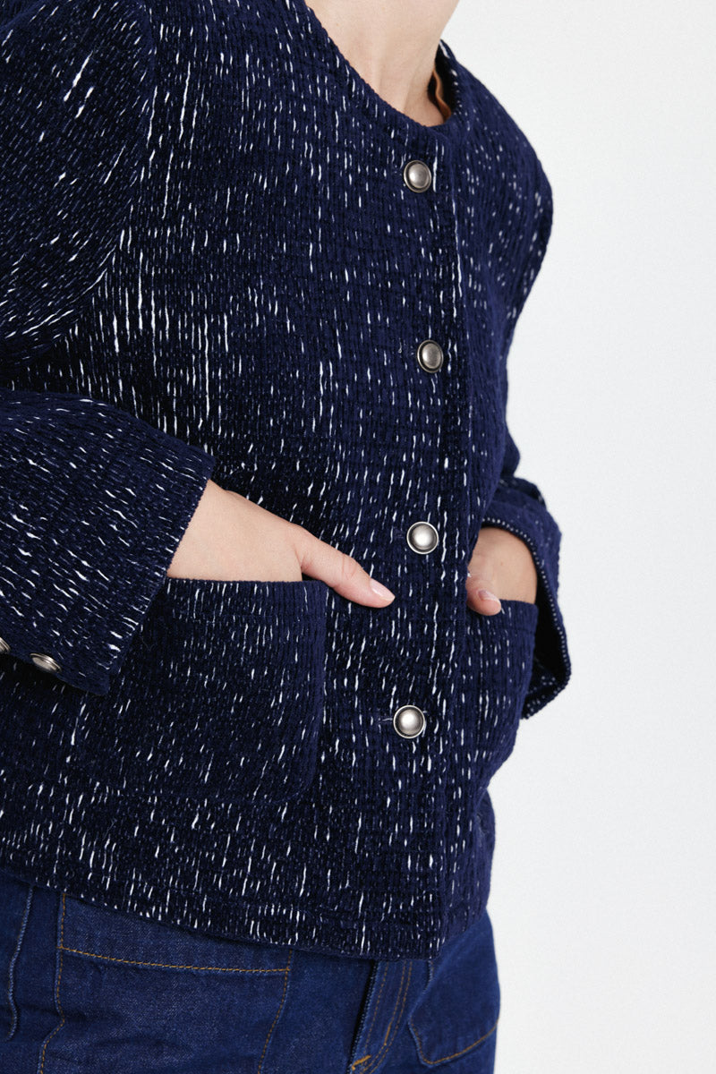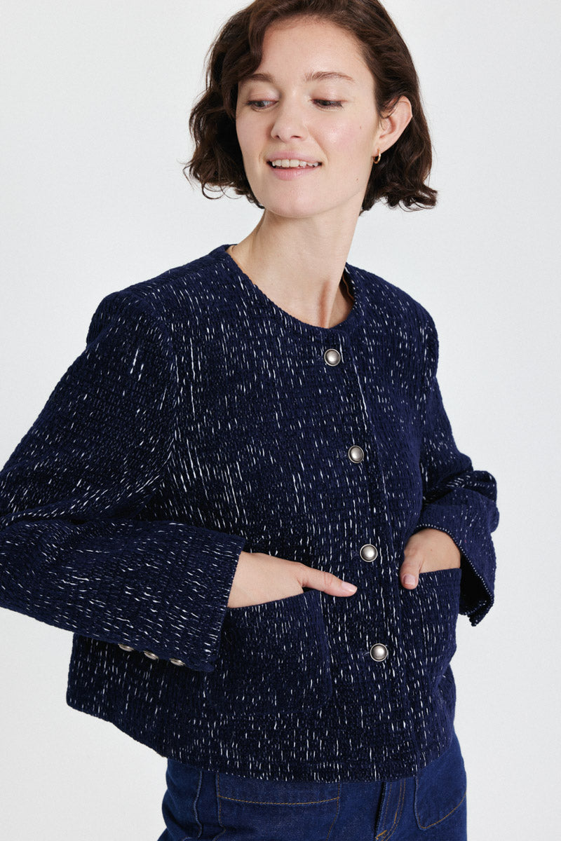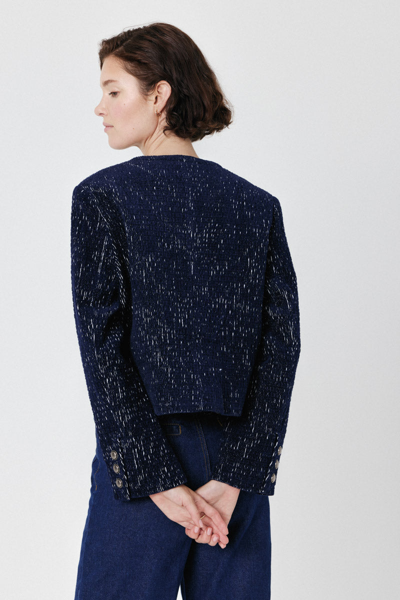 Veste en tweed bleu marine texturé, à manches longues et coupe courte. Fermeture à bouton-pression métalliques, dotée de poches plaquées à l'avant.