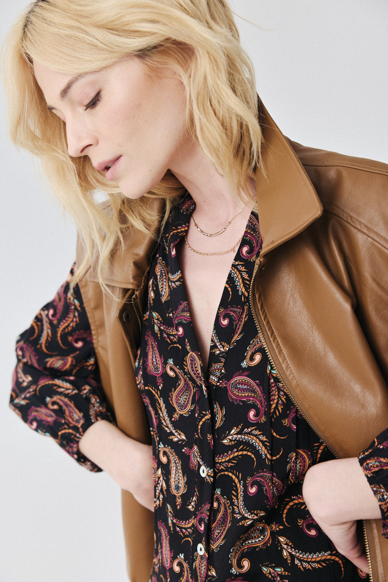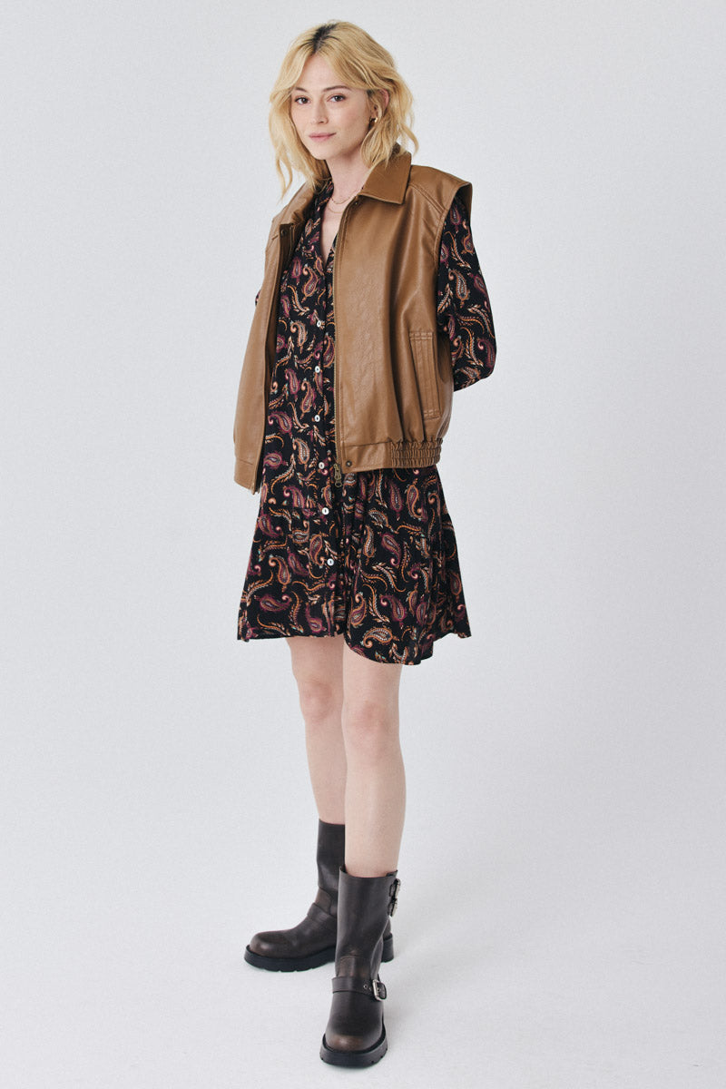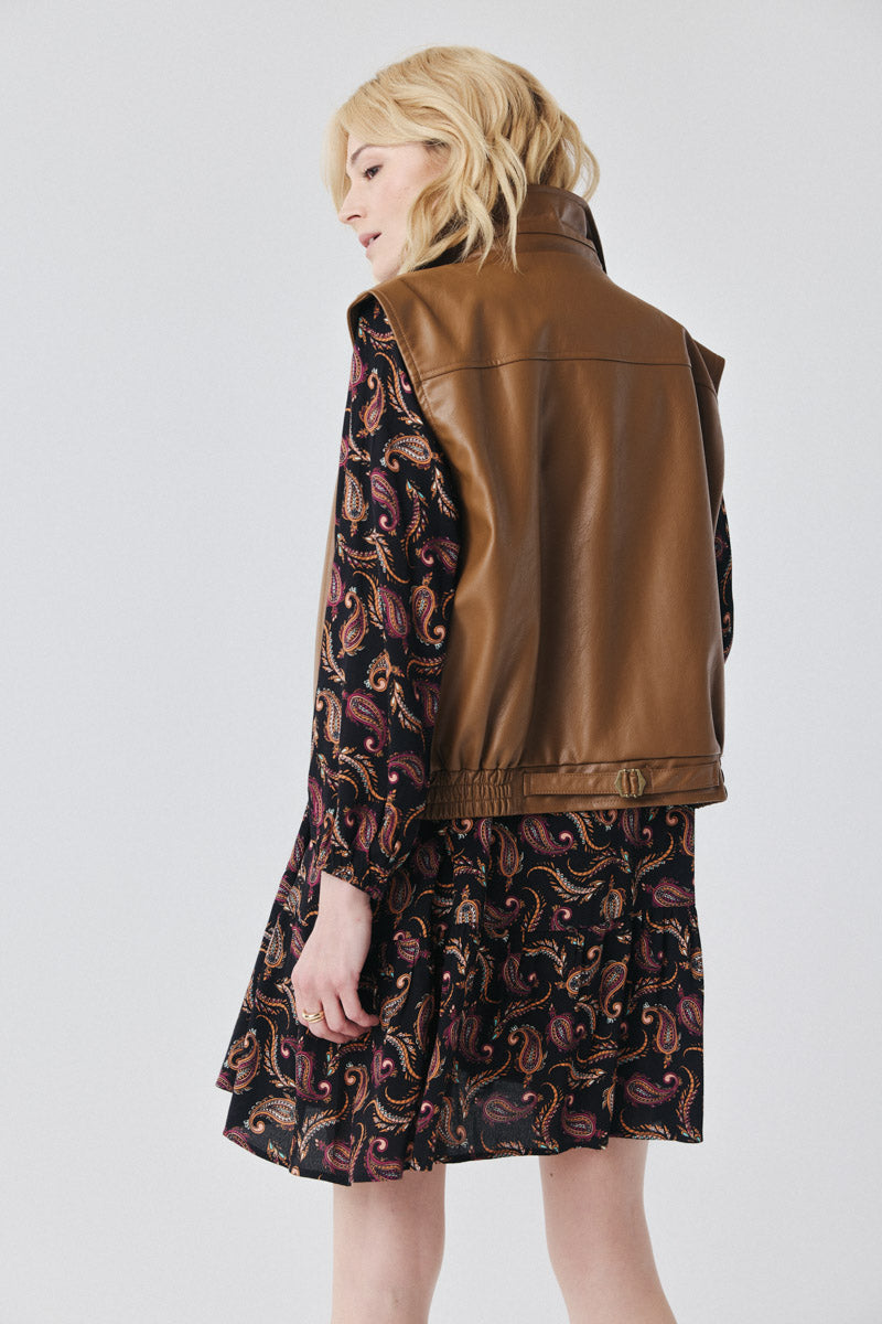 Veste sans manches en cuir parfaite pour superposer, avec une fermeture à bouton-pression et des poches avant pratiques.