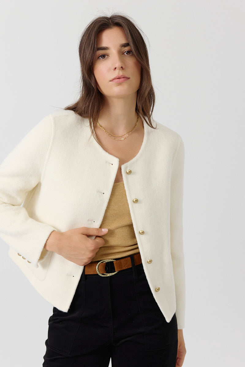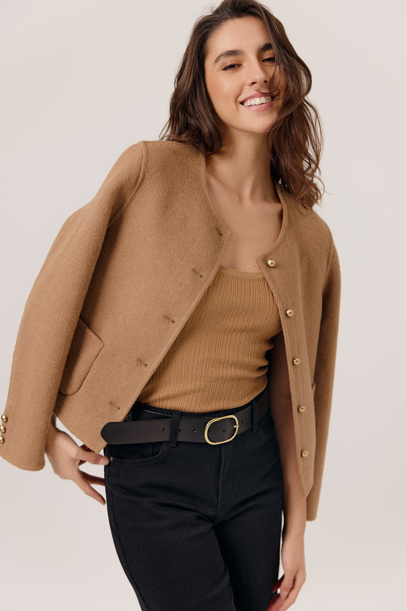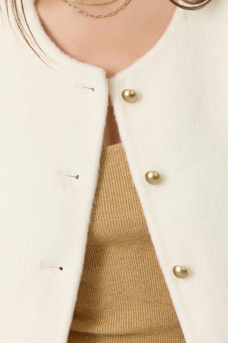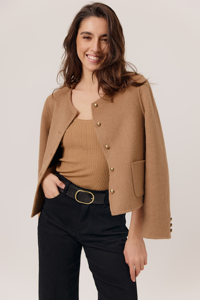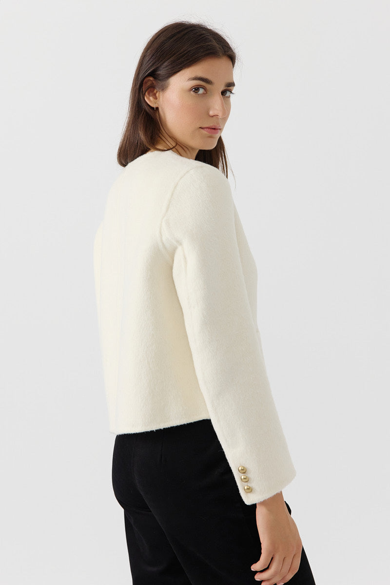 este courte à col rond, fermée par des boutons dorés et dotée de poches plaquées. Sa coupe élégante et structurée en fait une pièce intemporelle, parfaite pour compléter une tenue chic ou décontractée.