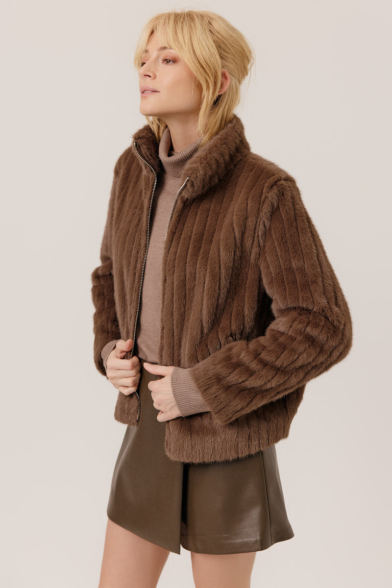 Veste courte en fausse fourrure à la texture douce et raffinée, dotée d’une fermeture zippée et d’un col montant. Une pièce élégante et chaleureuse, parfaite pour apporter confort et style aux looks de saison.